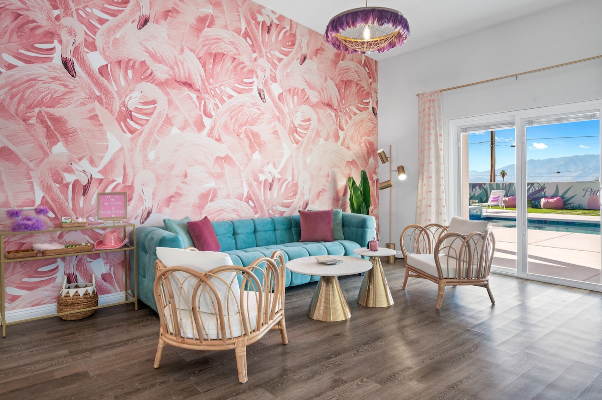 Chào mừng bạn đến với Palm Peach, một lễ hội sa mạc lấy cảm hứng từ Wes Anderson với đầy đủ màu sắc và nhân vật, hoàn hảo cho 8 khách. Tắm nắng trên ghế salon thủ công bên hồ bơi trong sân sau kiểu khu nghỉ dưỡng. Ngâm mình trong hồ bơi nước mặn lớn. Tận hưởng một spa nóng dưới những vì sao. Hoặc tụ tập quanh lò sưởi để tránh ớn lạnh. Trải nghiệm trò chơi ánh sáng đen và phòng hát độc đáo nhất với bức tranh tường màu đen, bàn bi-a 8ft, karaoke, trò chơi điện tử Simpsons và hơn thế nữa.