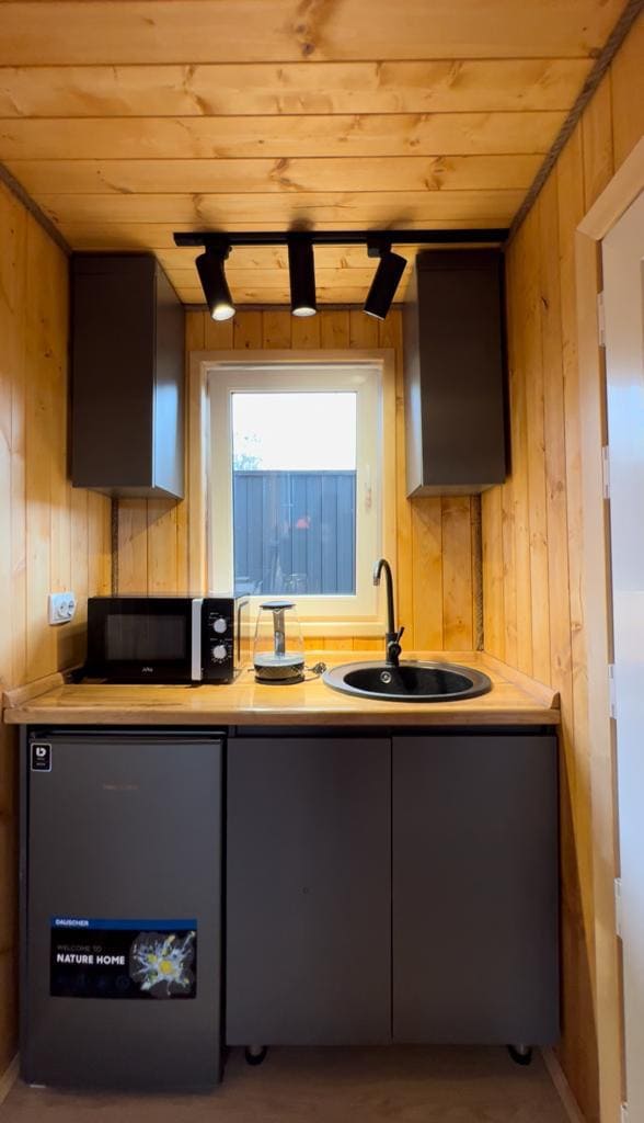 Step into Cube Cabin, a thoughtfully designed modern retreat with breathtaking valley views. The cabin features a beautiful kitchenette, a cozy dining space, and a lovely private patio to relax outdoors. It has two comfortable beds—one on the ground floor and another on the first floor—making it perfect for couples or small families. Large glass panels offer uninterrupted views of the valley, and every evening reward you with stunning sunsets right from the cabin.