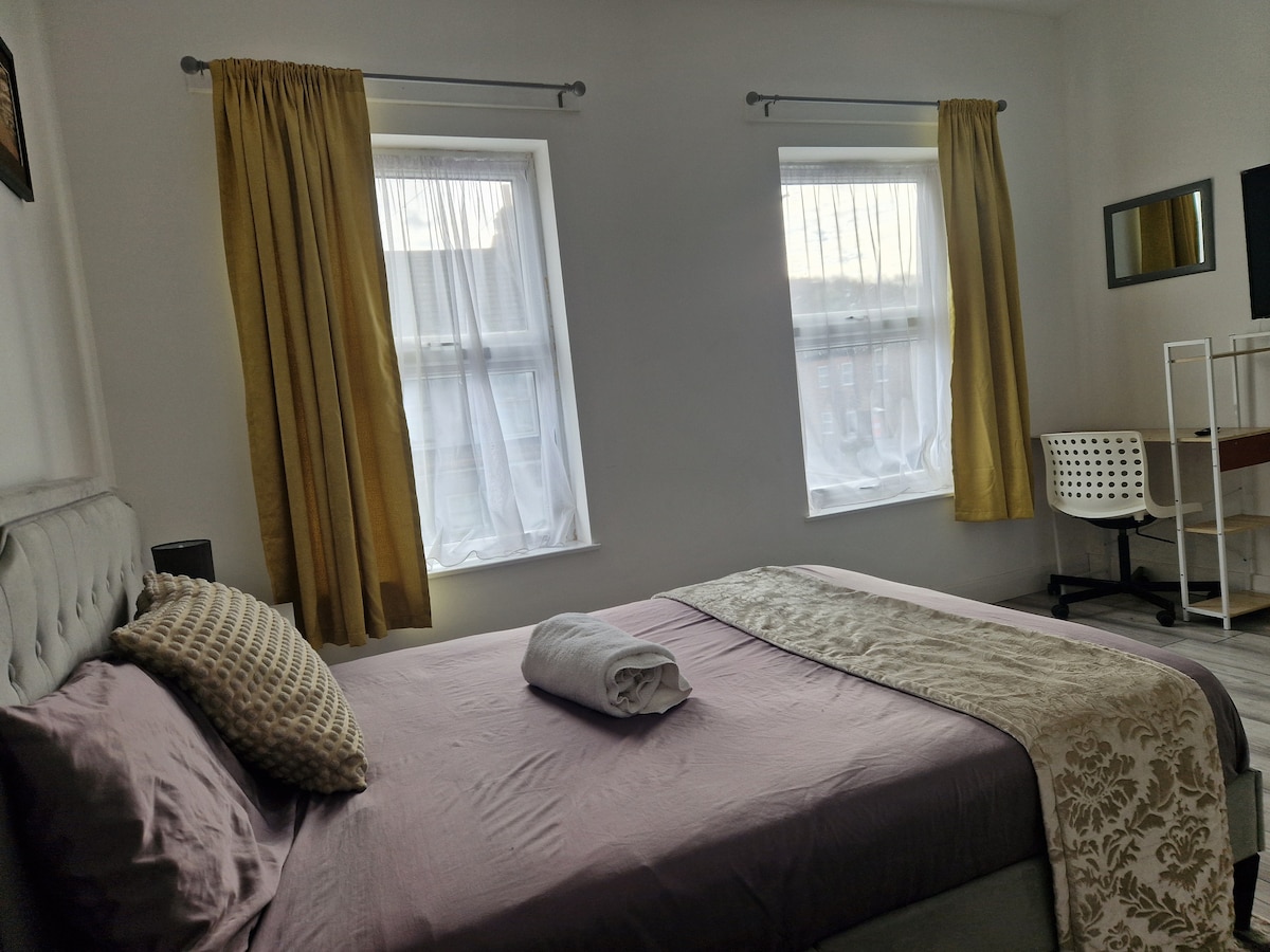 Our Kandy Suite (sleeps up to 6) is a stylish, modern second-floor apartment with Free Parking (1 vehicle) access to fantastic on-site amenities including a Gym, Yoga Studio, Cinema Room (booking required), Outdoor Area and Communal Lounge. Perfect for Contractors, Families, Holidaymakers and Business guests. It’s set in the heart of Bedford town centre—just a short walk to shops, restaurants, pubs, the River Great Ouse and attractions, with excellent transport links nearby.