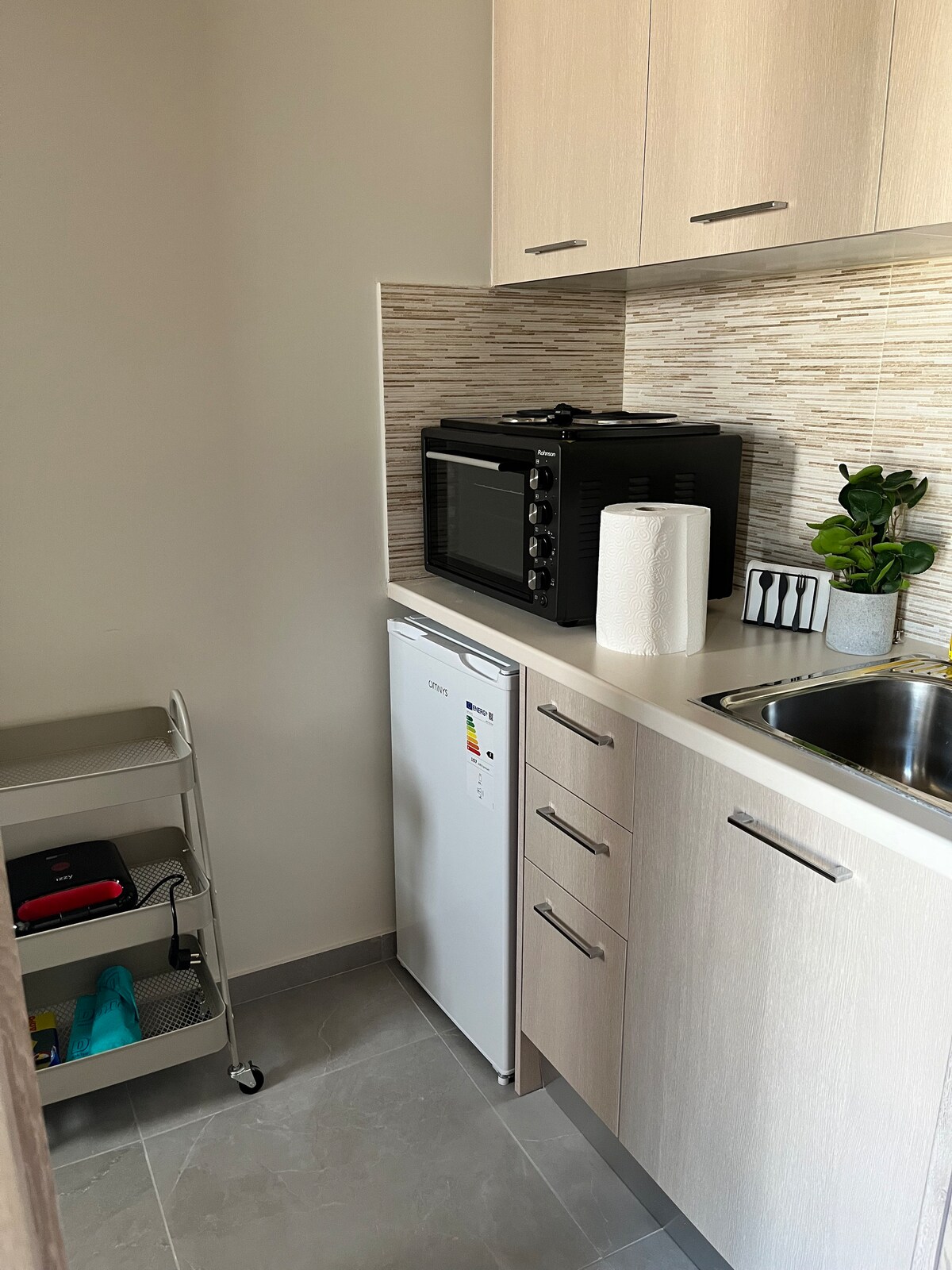 This exquisite apartment is located at Valaoritou street in Agia Paraskevi, one of the most beautiful areas of the southern suburbs of Athens that has a lot of green areas, quietness and safety. Its privileged position offers easy access to Attica Tollway (only 800 m away from junction Y3) and a convenient parking space. In order to go to the center of Athens, visitors will need approximately 11 minutes, as the metro station is only 90 m away from the apartment.The neighborhood has a lot of parks, restaurants,cofee shops,gym and a big super market near byThe whole building, the interior of the apartment and the exterior balkony area are constructed in a way, so that the house is functional and tasteful. Its equipment and furniture are selected with a focus on modern and minimal style. The apartment is arranged so that it can accommodate a couple or a family with (2) children. In the main area, there is a living room with a corner couch that is easily transformed into a bed, situated in front of the fireplace that creates a warm and cozy atmosphere in the cold winter nights. The kitchen is fully equipped with all necessary kitchenware and has a spacious refrigerator, a washing machine and an electric oven. The bedroom has a queen-size bed. When you open the main French window of the living room, you step out in a beautiful balkony with a lot of plants where you can enjoy a coffee, lunch or dinner with the company of friends