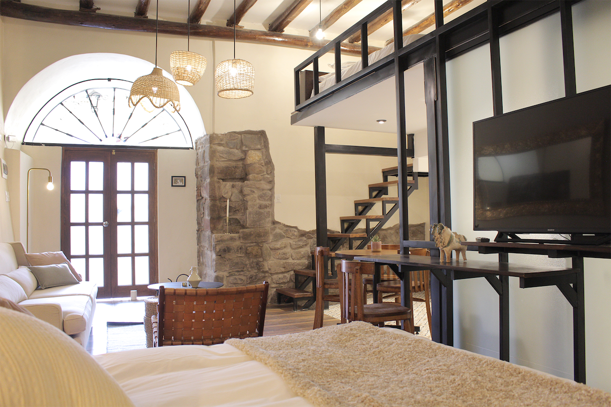 Bienvenidos a La Arquería Colonial Residence. Un espacio creado para que puedas disfrutar tus días en el Cusco y vivir la experiencia de estar en una casona colonial de los años 1600 a solo 3 cuadras de la Plaza de Armas y a media cuadra del museo Qorikancha. El loft cuenta con una cama queen, sala, escritorio para homeoffice, comedor, cocina completamente equipada, baño privado con tina, un altillo con una cama de dos plazas y terraza. Entrada independiente con salida a jardines de casona.