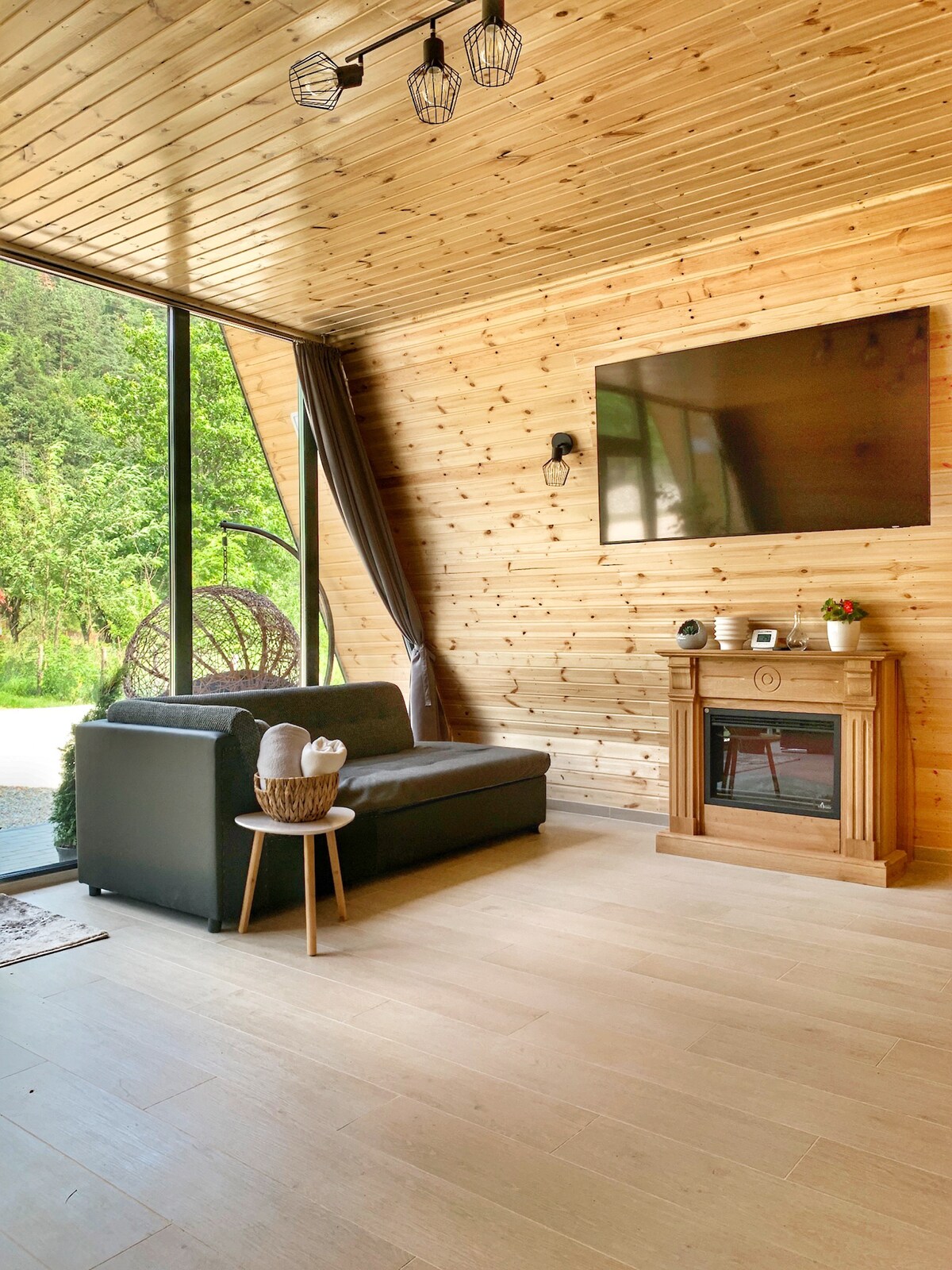 Nhà gỗ có một phòng khách rộng rãi với một chiếc ghế sofa giường. Trong phòng khách có lò sưởi và tiếp theo là nhà bếp được trang bị tủ lạnh, bếp nấu với lò nướng, máy pha cà phê, máy ép trái cây, máy rửa chén, lò vi sóng và các tiện ích khác. Ngôi nhà cũng có máy giặt. Trên lầu có 2 phòng ngủ, mỗi phòng có một giường cho 2 người. Khả năng chứa 6 người (4 người trong phòng ngủ và 2 người trong phòng khách, trên ghế sofa mở rộng)