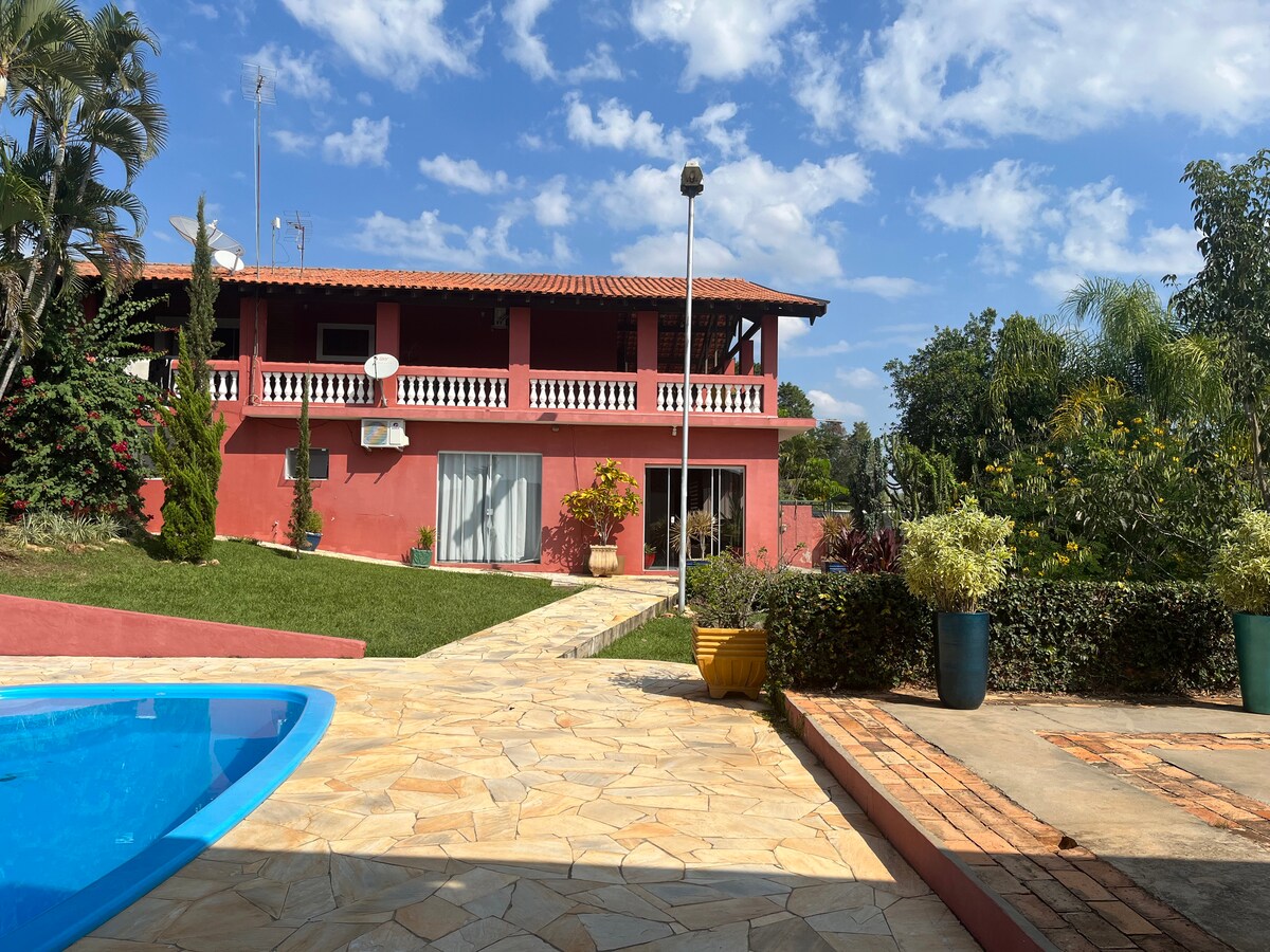 Ngôi nhà lớn trên một địa điểm có rất nhiều thiên nhiên. Phòng khách và phòng ăn, 4 phòng ngủ, 3 phòng tắm (2 phòng tắm khép kín, 1 phòng tắm cho 2 phòng ngủ và 1 phòng tắm bên ngoài), nhà bếp đầy đủ tiện nghi, lò sưởi, ban công có võng, hồ bơi, bếp nướng, lò nướng pizza, lò sưởi. Hướng nhìn hoàng hôn tuyệt đẹp. Campinho de futebol, cưỡi ngựa, trứng thả tự do từ địa điểm. Cách thành phố 3 km với tiệm bánh, siêu thị, v.v. Wi-fi tuyệt vời cho công việc. Giá thuê cho tối đa 8 người. Nhà có máy báo động và camera an ninh.