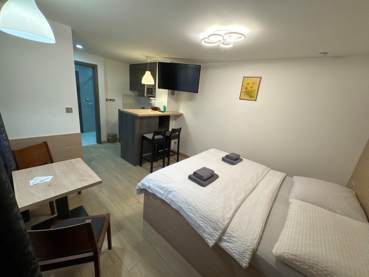 Một căn hộ lý tưởng cho một cặp đôi. Nhà bếp và phòng khách có không gian mở Dow lầu với hệ thống sưởi sàn và lối vào ban công và phòng tắm. Cầu thang xoắn ốc đến một phòng ngủ gác mái với một giường đôi và một giường sofa. Ban công với một cái bàn và ghế nhỏ.