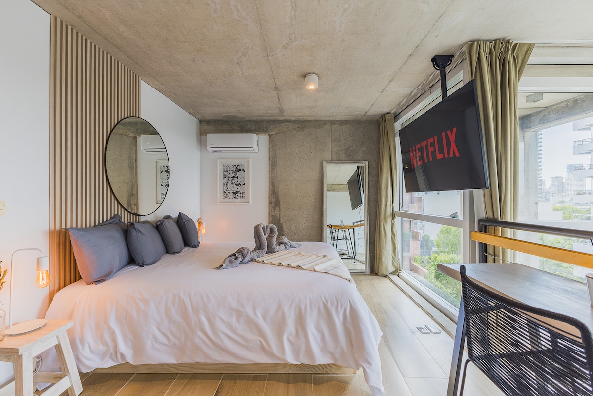 Studio hoàn toàn mới tuyệt đẹp nằm trong khu phố Palermo. Căn hộ có tất cả các tiện nghi để tận hưởng thời gian lưu trú tuyệt vời ở Buenos Aires. Wifi , TV truyền hình cáp 50 inch, giường đôi, bếp được trang bị đầy đủ tiện nghi (lò nướng điện, lò vi sóng, máy nướng bánh mì, ấm đun nước điện, v.v.). Căn hộ nằm ở tầng 6 cho phép bạn có ánh sáng suốt cả ngày.