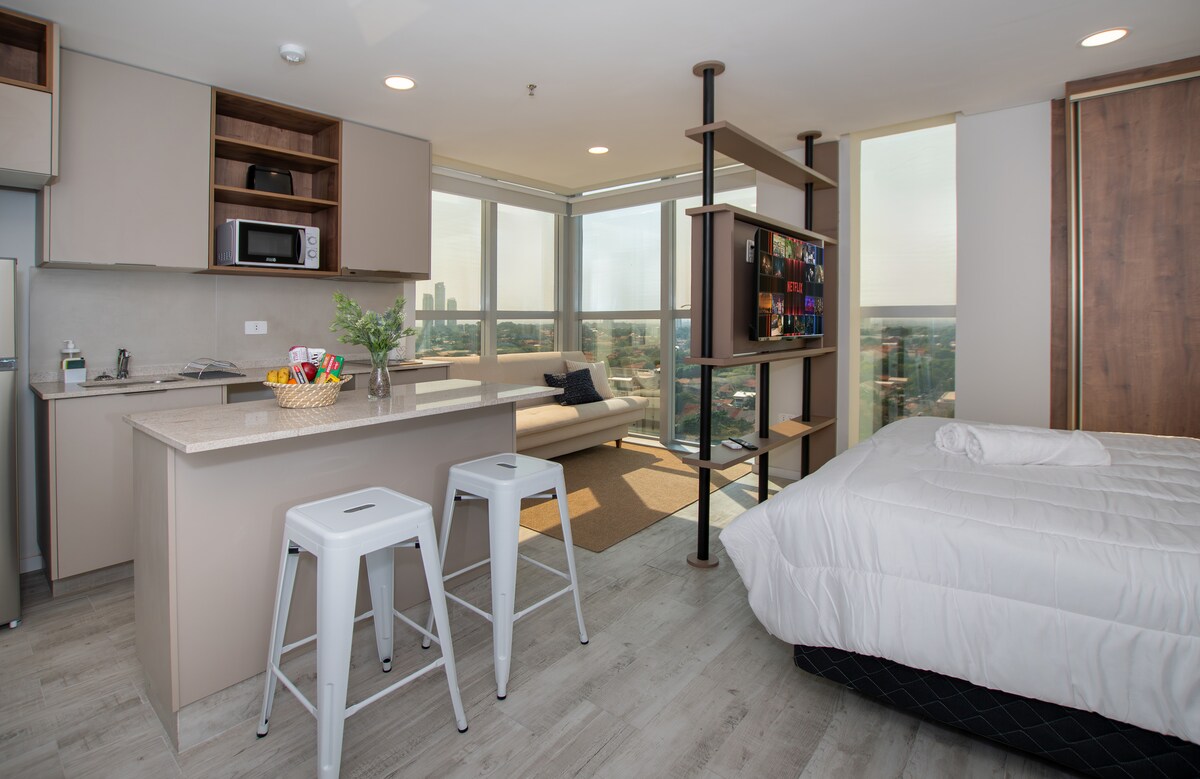 Căn hộ 1 phòng ngủ phong cách tại một trong những khu vực tốt nhất ở Asuncion, cách các trung tâm mua sắm hàng đầu một quãng đi bộ. Tận hưởng nhà bếp đầy đủ tiện nghi, phòng khách thoải mái, ban công và sử dụng các tiện nghi tuyệt vời của tòa nhà: hồ bơi trên tầng thượng và phòng tập thể dục. Được thiết kế cho thời gian ở ngắn hạn và dài hạn với quầy lễ tân 24 giờ để thuận tiện cho bạn. Một không gian ấm cúng để thư giãn và cảm thấy như ở nhà.