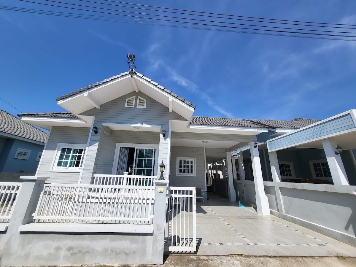Stylish House Near the International Circuit This modern house is ideally located near Chang Arena (4.2 km), Chang Circuit Buriram (5.9 km), and Big C (1.5 km). The house: - Two high-quality bedrooms with comfortable queen-size beds - Two bathrooms - A living room - A fully equipped kitchen with a washing machine - 500 Mbps Wi-Fi and cable TV - Complimentary coffee and drinking water The two bedrooms are located on the SECOND floor, while downstairs you will find the living room and kitchen