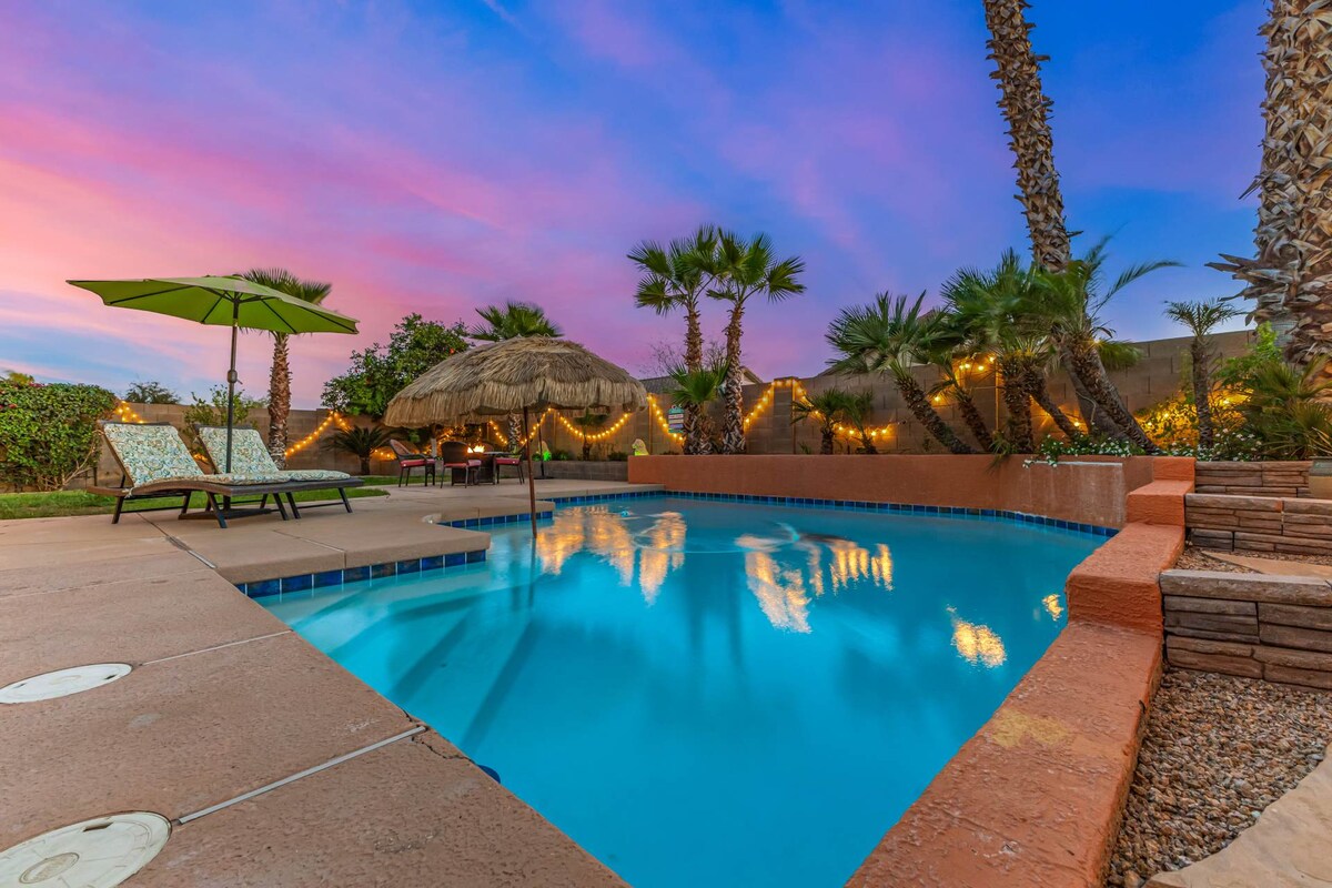 Chào mừng bạn đến với kỳ nghỉ trên sa mạc! Tận hưởng bố cục thoáng đãng, thoáng khí với phòng khách rộng rãi, bếp đầy đủ tiện nghi, không gian ăn uống phong cách và phòng ngủ mang lại cảm giác như ở nhà. Bước ra ngoài sân sau riêng tư được thiết kế riêng để thư giãn và vui chơi phù hợp với gia đình. Tận hưởng một lần ngâm mình trong hồ bơi và spa được sưởi ấm, thư giãn trên xích đu sân hiên hoặc đốt lửa nướng để có một bữa tối ngon miệng. Nằm cách Sân vận động Arizona Athletic Grounds chỉ 15 phút. Đừng quên chơi một vòng tại Câu lạc bộ Golf Las Colinas!