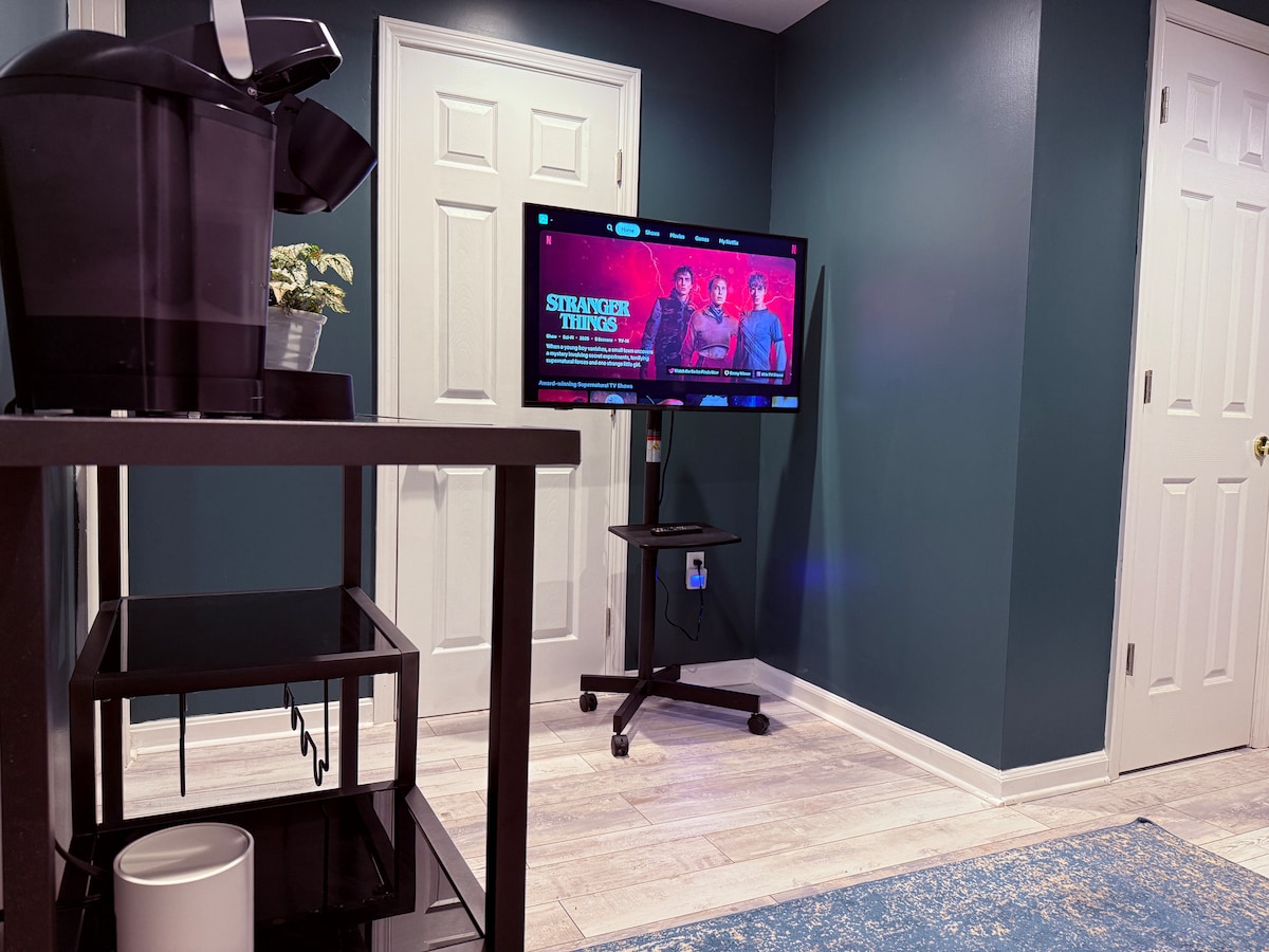 Welcome to our stylish basement apartment, perfect for modern travelers. Whether you're here for work or leisure, this space has you covered. Situated minutes from the Metro, Airport, and major work centers. The apartment features a desk with dual monitors, keyboard, mouse, and 1GB internet. At night, relax in the plush king-size bed. A convertible futon couch with a 65-inch TV, awaits your binge-watching sessions. A washer/dryer and full kitchen, w/refrigerator and stove complete the space.