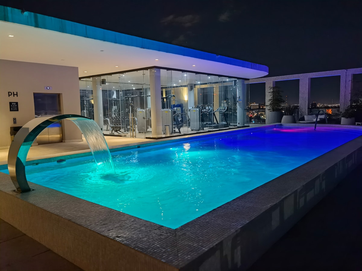 Very spacious home with two bedrooms (King and Queen), AC, smart lights, electric curtains, high speed internet Wi-Fi, Infinity pool, lounge area, roof garden and everything you need for a day or many months stay. The tower has a shopping area, top-notch restaurants, and it is walking distance from Landmark, Andares and Acueducto malls and The Colomos forest. We sanitize and clean the entire condo. Please read the rules before you reserve.
