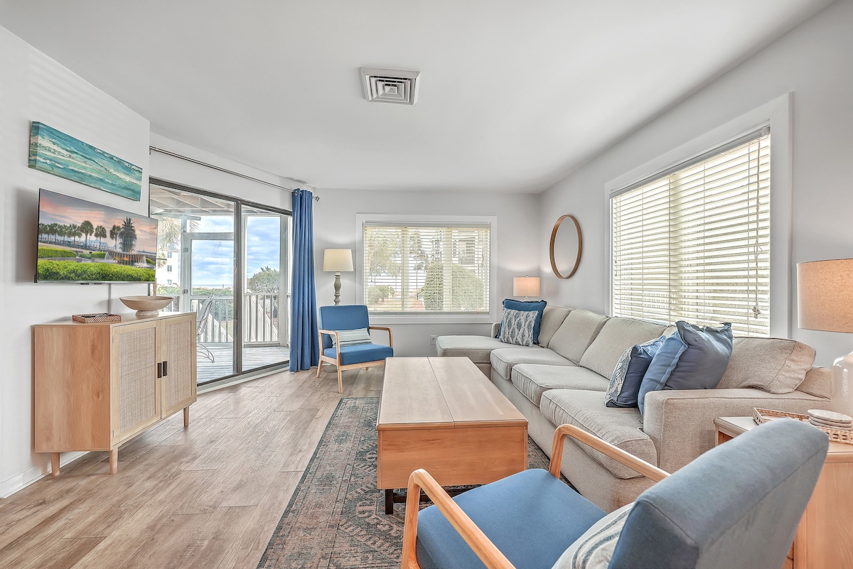 1st Floor 1 BR 1 BA Windswept Villa for two (beds for up to 4 adults) just steps to the beach! NO PETS PERMITTED. New for 2024 - Custom tile walk in shower! Updated kitchen includes Kraftmaid cabinets and granite countertops. Large living room with 50" smart cable TV and WIFI. Bedroom with king memory foam mattress, all linens provided. Queen Murphy Bed sleeps additional 2 adults on 10 in memory foam mattress. Custom tile walk in shower. Separate toilet room. Laundry room with washer, dryer.