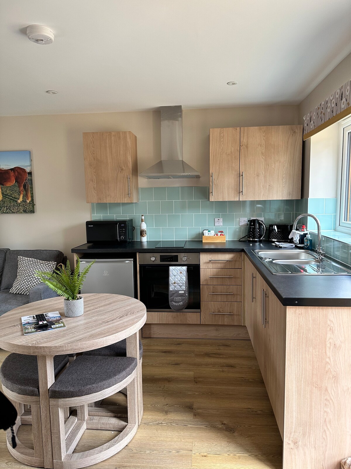 Căn hộ khép kín mộc mạc này nằm phía trên Cart Lodge. Được tiếp cận bằng các bậc thang (chúng khá dốc nên có lẽ không phù hợp với người ốm yếu), đó là một phòng lớn với giường cỡ king, bếp đốt củi đáng yêu (gỗ được cung cấp), khu vực nhà bếp được trang bị đầy đủ tiện nghi với bàn ăn và ghế, ghế sofa và TV/dvd/radio/cd lớn. Có một phòng tắm vòi sen nhỏ ở cuối. Có một bộ sưu tập DVD và tạp chí để bạn sử dụng. Không có WiFi.