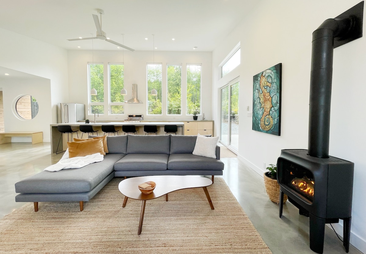 BÃO ĐEN TOFINO IG: @blackstormtofino Vị trí ven sông trên cửa sông. Ngôi nhà sang trọng này nằm trong rừng nhiệt đới và quay lưng lại với một khu bảo tồn động vật hoang dã được bảo vệ. Đi bộ đến Bãi biển Chesterman và Vịnh Cox - các bãi biển lướt sóng nổi tiếng của Tofino. Khu dân cư 3 phòng ngủ, 3 phòng tắm này cung cấp tất cả các tiện nghi - bồn tắm nước nóng, phòng xông hơi, bộ sạc EV, bếp cho người sành ăn, lò sưởi ga, vòi sen lướt sóng, hố lửa, BBQ và sân hiên có mái che. Được thiết kế để bảo vệ sự riêng tư, mang lại sự thoải mái tinh tế và kết nối yên bình với thiên nhiên.