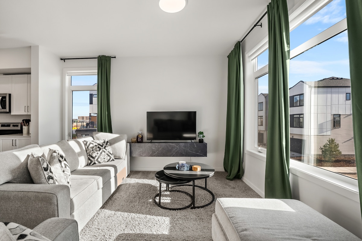 Căn hộ 3 phòng ngủ hiện đại hoàn toàn mới ở Belvedere với phòng Master Suite giường cỡ King Hãy bước vào căn hộ duplex mới xây, đầy phong cách này với không gian sống, ăn uống và bếp mở rộng rãi – lý tưởng cho các gia đình, nhóm hoặc người đi công tác. Chỉ 15 phút đến trung tâm thành phố Calgary, 10–15 phút đến sân bay YYC, gần khu mua sắm East Hills, 90 phút đến Banff. Có thể ở tối đa 8 người: Phòng ngủ chính có giường cỡ King với phòng tắm khép kín và tủ quần áo không cửa ngăn, hai phòng ngủ có giường cỡ Queen, cộng với sofa giường trong phòng khách. Wifi tốc độ cao, TV lớn và chỗ đỗ xe riêng. Chỗ ở tươi mới, thoải mái của bạn