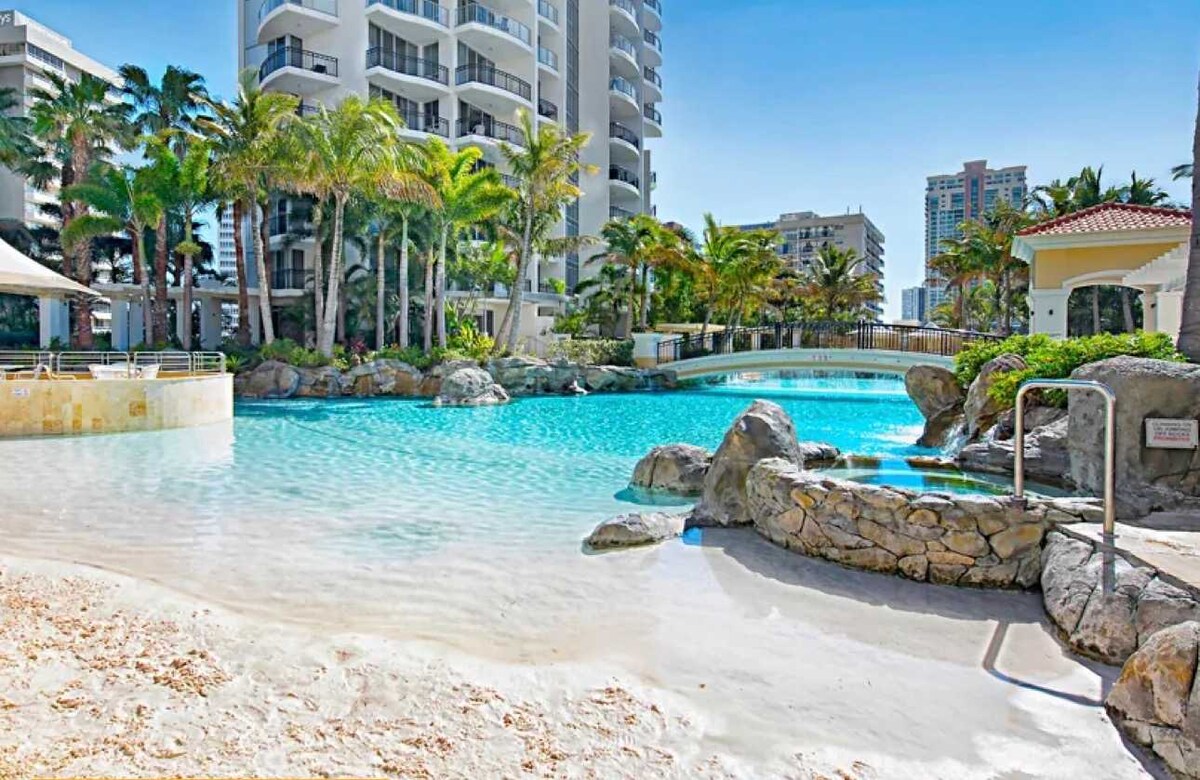 Chào mừng bạn đến với studio 1BR ở tầng trệt của chúng tôi, hoàn chỉnh với giường queen, nhà bếp đầy đủ và Wi-Fi. Những người yêu thú cưng hãy vui mừng - chúng tôi thân thiện với chó (áp dụng nội quy nhà)! Thư giãn trên sân hiên ngoài trời riêng của bạn hoặc tận dụng các tiện nghi của khu nghỉ dưỡng, bao gồm hồ bơi, spa, phòng tập thể dục - tất cả đều có tầm nhìn ra sông. Bãi đỗ xe có thu phí thuận tiện với mức giá được cung cấp trong chi tiết đặt phòng của bạn. Với xe điện, Cavil Av và bãi biển chỉ cách đó 10 phút, bạn sẽ được trải nghiệm Surfers Paradise!