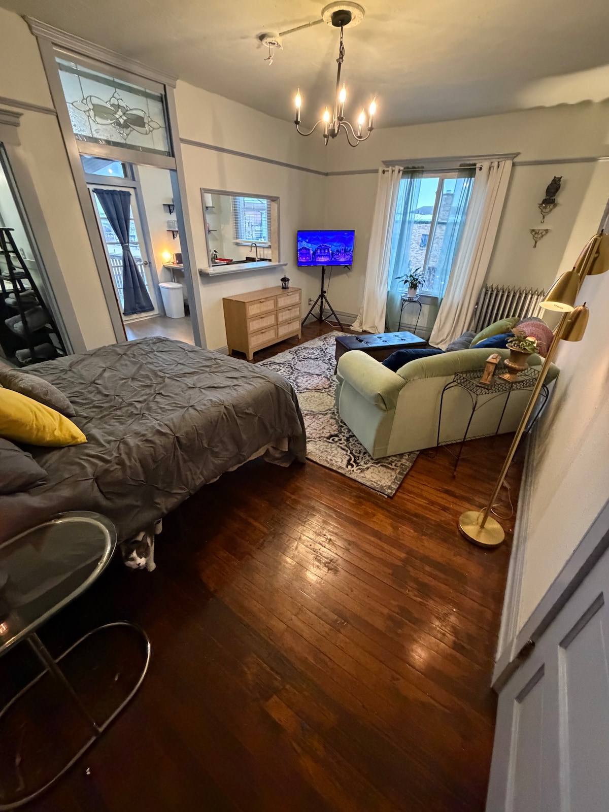 Căn hộ mới được tu sửa với sàn gỗ cứng và mặt bàn bằng đá granit. Hai phòng ngủ , một phòng có giường queen và phòng còn lại có giường đơn với giường đẩy trượt ra ngoài. Ngôi nhà này rất rộng rãi và thoải mái. Có thể đi bộ đến các địa điểm ăn uống và sự kiện ở trung tâm thành phố. Phải leo cầu thang.