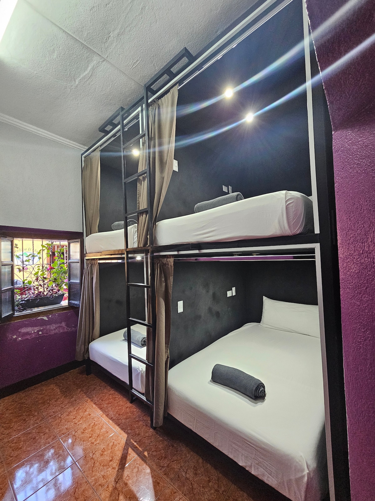 Chúng tôi cung cấp các phòng chung với giường kiểu con nhộng: rộng rãi, thoải mái và được thiết kế để đảm bảo sự riêng tư. Mỗi giường đều có rèm cửa, đèn đọc sách cá nhân và ổ cắm điện riêng — mọi thứ bạn cần trong không gian ấm cúng của riêng bạn. Một thiết lập chức năng kết hợp sự thoải mái, riêng tư và tiện lợi với mức giá phải chăng.