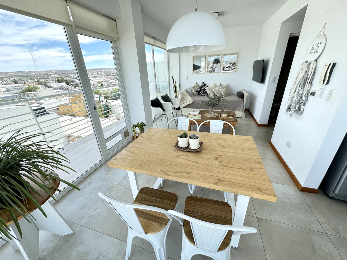 Excelente ubicación a metros el mar. Fácil acceso desde el aeropuerto y terminal. En temporada de ballenas se pueden ver y escuchar desde las ventanas del alojamiento. Departamento nuevo. Vista al mar desde todas las ventanas. Último piso del edificio con balcón abierto. Calefacción por loza radiante. Aire acondicionado para el verano. Cochera privada. El alojamiento es ideal para un matrimonio con un hijo o un grupo de 3 personas.