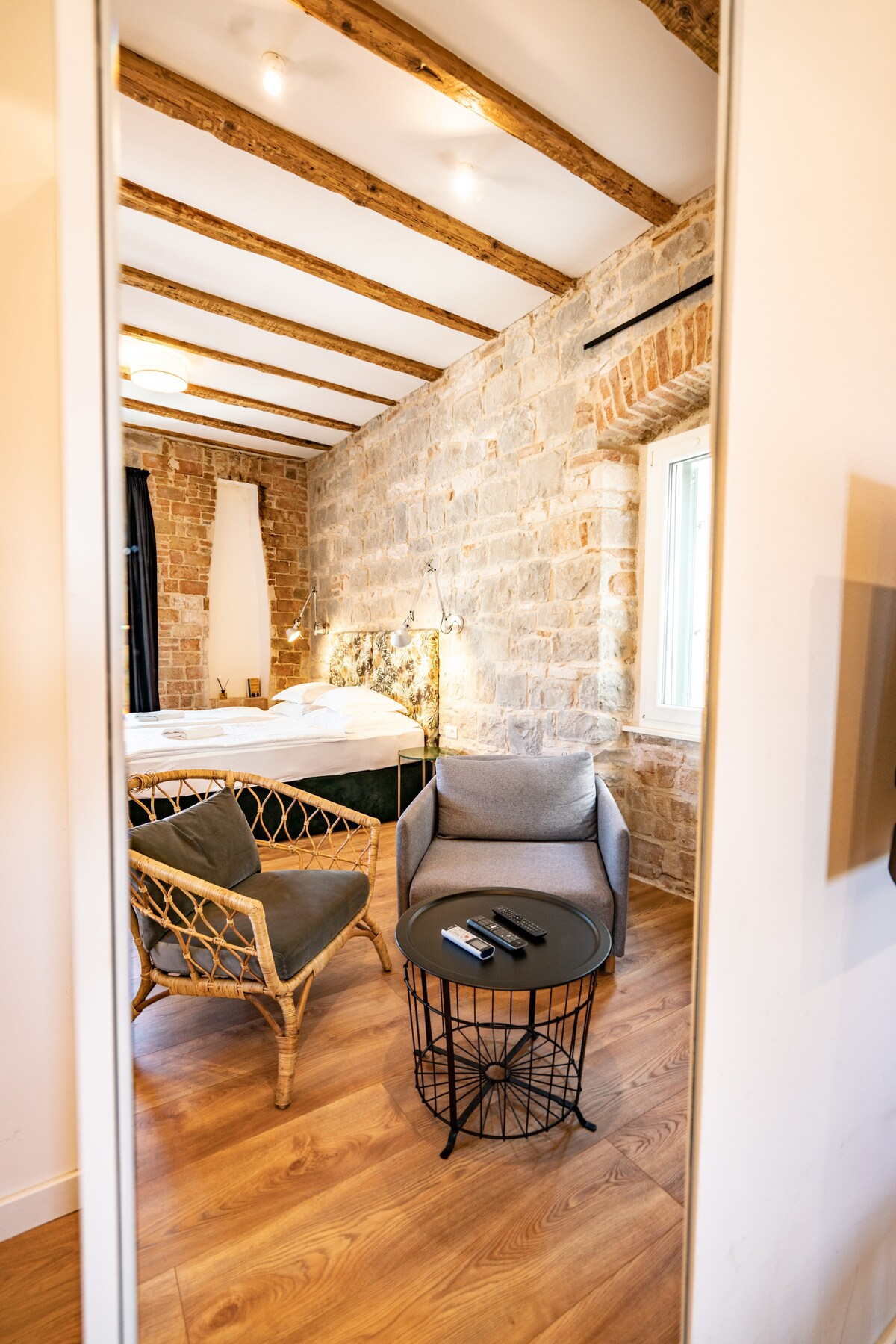 Tỉnh dậy bên dưới những chùm trần gỗ hàng thế kỷ trước. Bị quyến rũ bởi những nét cổ xưa, cầu thang mang phong cách công nghiệp và những lớp hoàn thiện tinh tế ẩn phía sau những vòm đá khổng lồ bên trong của Hoàng cung. Đắm chìm trong lịch sử, uống một ly rượu vang từ ban công của căn gác độc đáo này sau khi khám phá những thú vui của Split, nơi các tác phẩm của bảo tàng tô điểm cho một bảng màu cát và màu đất bị tắt tiếng.