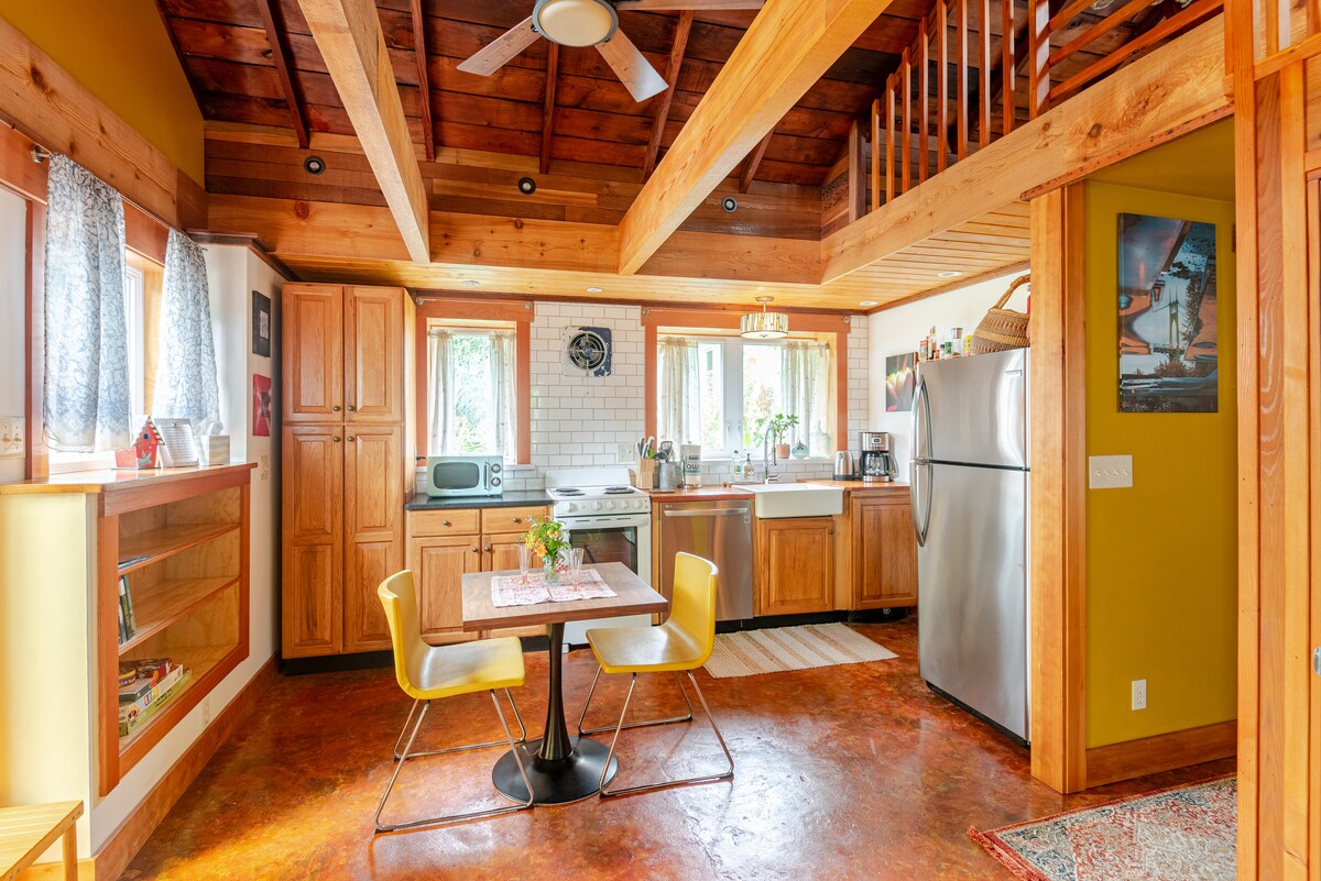 NE Portland Alberta Arts; cozy guest house, sleeps 4. We welcome ALL guests!! No cleaning chores. Dogs ok- $50 fee. Full kitchen, bath/tub; courtyard w/fire pit. Cathedral ceiling, exposed woodwork, local art. Spiral staircase to loft w/adjustable queen bed; comfortable sofa bed, sleeps two; washer/dryer; desk/workspace; Kitchen w/ dishwasher, fridge, cooking supplies, oven, microwave. Coffee, tea, seltzer and snacks supplied. Bluetooth radio, WiFi, hard-wired Ethernet, TV/Roku/Netflix.
