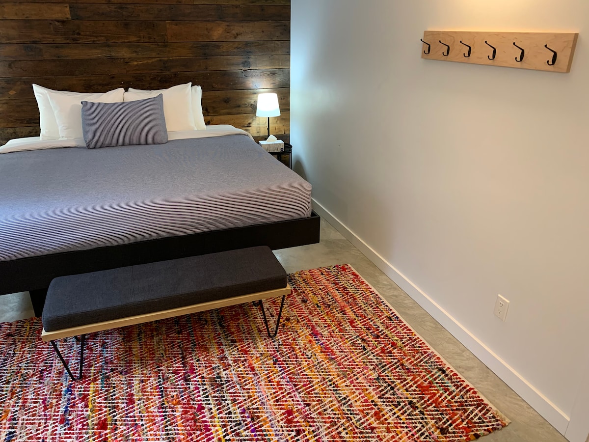 Căn hộ 1 phòng ngủ lấy cảm hứng từ lướt sóng hoài cổ nằm trên một con đường yên tĩnh chỉ cách trung tâm Tofino vài phút đi bộ. Phòng được trang bị bếp nhỏ và có không gian ngoài trời riêng nép mình giữa những tán cây. Chỗ đỗ xe được cung cấp trong khuôn viên. Phòng có giường cỡ king và không có bố trí chỗ ngủ nào khác cho khách thêm. Chúng tôi có một bộ đồ chơi/giường ngủ cho trẻ sơ sinh hoặc trẻ mới biết đi 2024 Giấy phép kinh doanh Tofino # 20240423