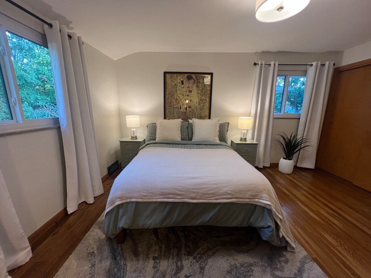 ⭐ Nổi bật trong danh sách Columbus tốt nhất của Condé Nast, tháng 5 năm 2025 Ngôi nhà ✔️ độc đáo những năm 1930 với các yếu tố của kiến trúc Phục hưng Tây Ban Nha ✔️ Hai phòng ngủ ở tầng chính (bậc thang tối thiểu); một giường queen (có phòng tắm khép kín) và một giường đầy đủ Tác phẩm nghệ thuật được tuyển chọn ✔️ cá nhân, được thu thập và làm thủ công bởi chủ sở hữu Đường lái xe ✔️ riêng và bãi đỗ xe ngoài đường; sạc xe điện với bộ chuyển đổi Tesla Địa điểm ✔️ trung tâm Clintonville; đi bộ đến cửa hàng tạp hóa Weiland trong 10 phút, Starbucks (High St.) trong 11 phút và nhiều nhà hàng hơn trong 15 phút