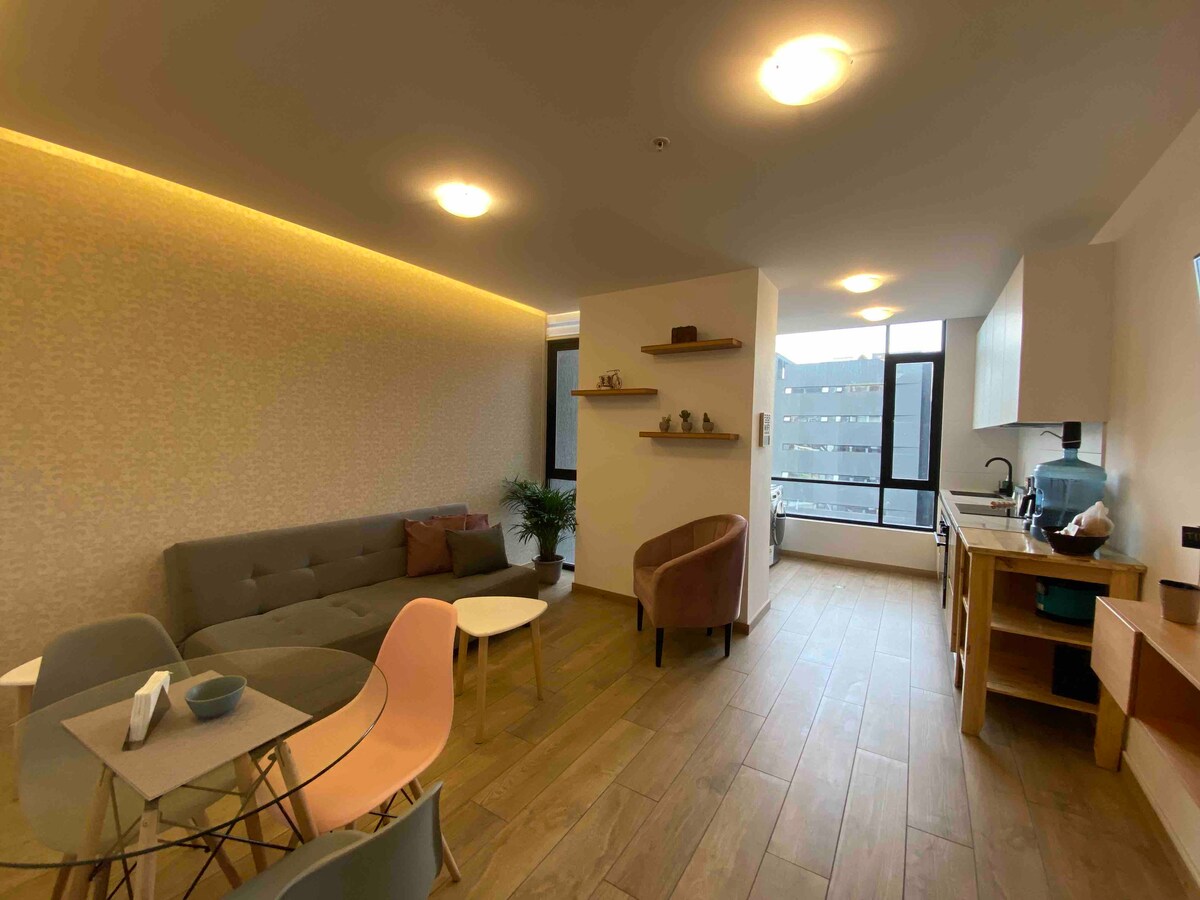 Modern, brand-new studio on the 14th floor with direct views of La Carolina Park. Studio amenities: • High-speed fiber optic WiFi • 55” QLED Smart TV • Ultra-comfortable bed • Fully equipped kitchen • Modern bathroom • Smart lock • 24/7 security Social areas (17th floor): • Gym • Coworking area with WiFi • Game room • BBQ area • Jacuzzi (available only for stays longer than two nights) Prime location, just 15 minutes from the Quito Metro, malls, and restaurants.