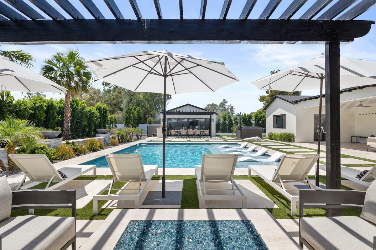 Unveiling Surrey Palms, a lavish vacation retreat! With 5 bedrooms, 5.5 bathrooms, and an optional 6th bedroom in the casita, this exquisite property sits on a beautifully landscaped and private half-acre lot. Enjoy the heated pool ($100/day extra), two fire pits, Sonos system gracing both indoor and outdoor spaces, a refreshing misting system, media room, a well-equipped gym, a detached game casita, and a sports court. Prepare for an unforgettable stay filled with indulgence and relaxation!
