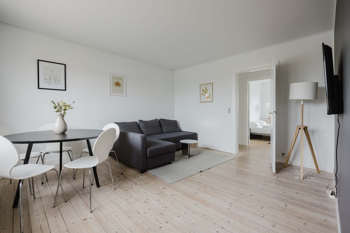 Wake up to soft light on pale wooden floors and enjoy your coffee in the bright, open kitchen. The space feels warm and personal, with art, photos, and cozy touches. Step onto the balcony for a view of the leafy square. Located between Fælledparken and Svanemøllen Beach, with shops, cafés, and public transport nearby. The metro is just a minute away, and the city center is 10 minutes by bike. Street parking is available via EasyPark, with free options nearby.