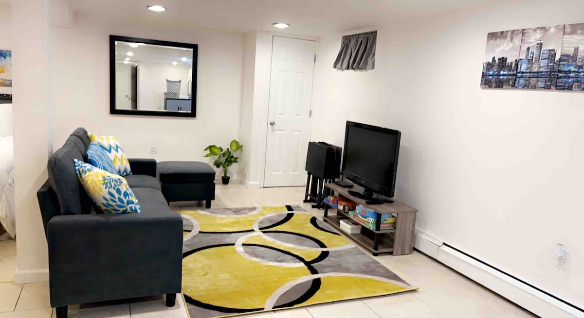 Đó là một tầng hầm riêng, một nơi yên tĩnh. Nó vẫn thoải mái quanh năm. Nó có lối vào riêng biệt. Có bộ chuyển đổi có thể sử dụng làm mát và sưởi ấm. Nguồn cung cấp cà phê trà có sẵn miễn phí. Chai nước và giỏ đồ ăn nhẹ là WiFi của họ có sẵn và bạn có thể thưởng thức Netflix YouTube. Có một giường queen trong một phòng và một giường đơn trong phòng khác để 3 người có thể thoải mái ngủ với sự riêng tư của họ. Chỗ này cách LIRR 6 phút đi xe hơi. DoorDash và Uber Eats giao đồ ăn dễ dàng.