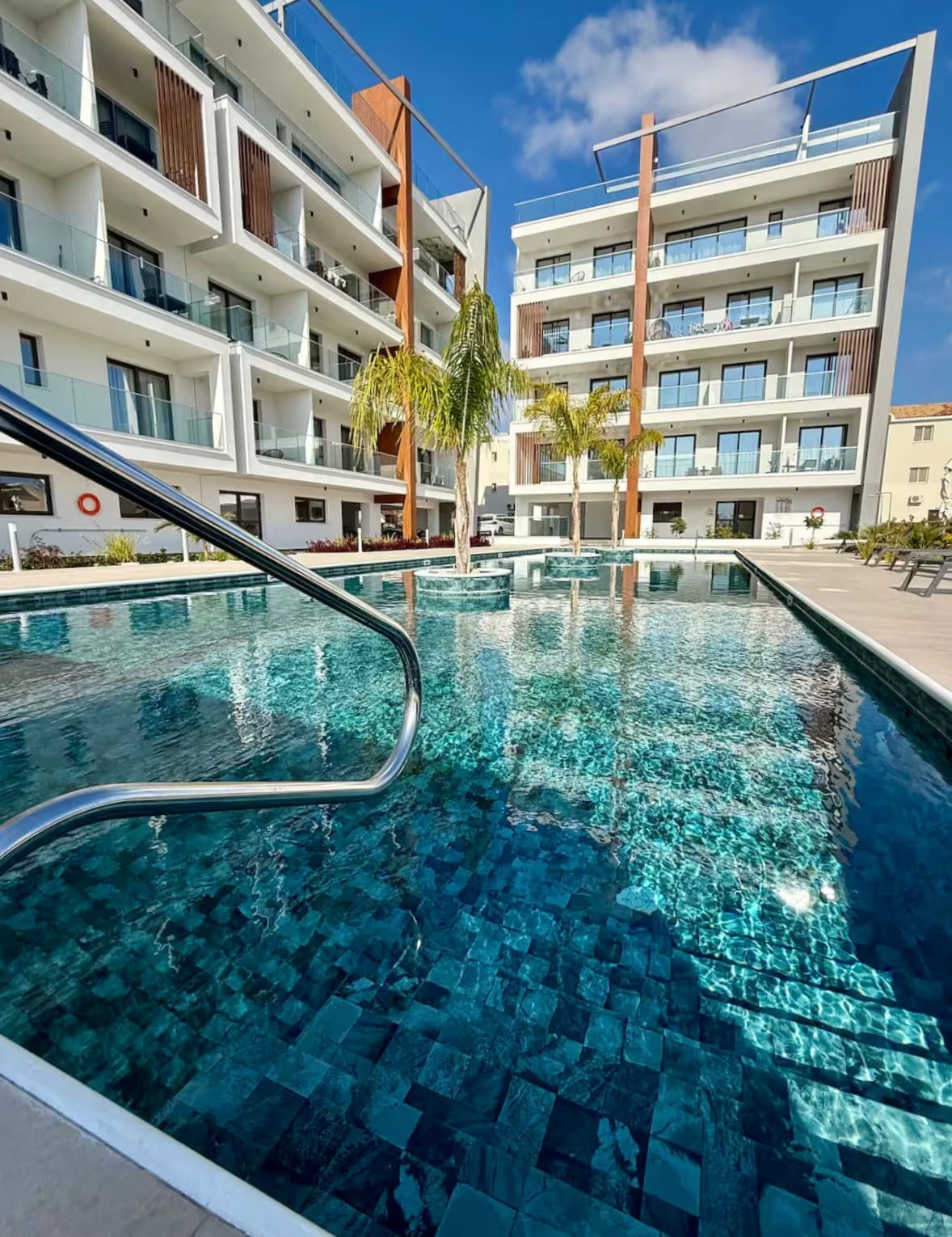 Located in the center of Paphos Town, Elysia Park features a pool with sun terrace amidst its landscaped gardens. It offers high quality self-catering accommodation in Paphos, Cyprus. Overlooking the pool, my apartment has a seating area with sofa and a kitchen with fridge and stove. It is equipped with air conditioning, a washing machine and an 55” LCD TV. The private bathroom comes with a bathtub and the other one inside the master bedroom with shower.