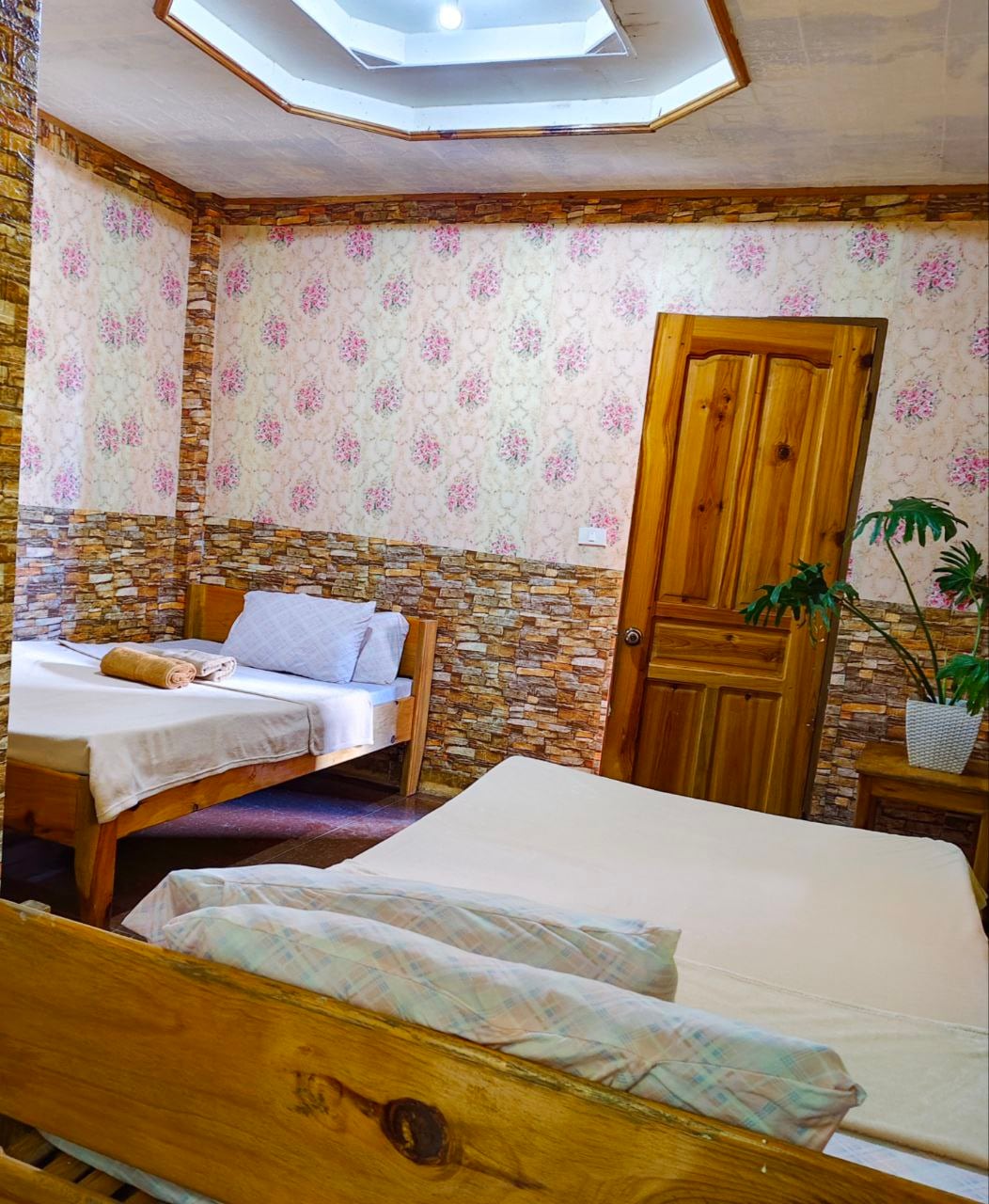 Amlangan Lodge room 3 is a private cozy room with 2 "double size" beds. It is located one floor level down the building entrance/lobby/dining with stairs to take. It has private toilet (with bidet) , sink, & bathroom (with hot shower) separate from each other, enabling guests to use these simultaneously and keeping the toilet floor clean, dry, and more comfortable. It has a balcony with a stunning view of pine forest & rock formations, which can also be viewed from your bed.