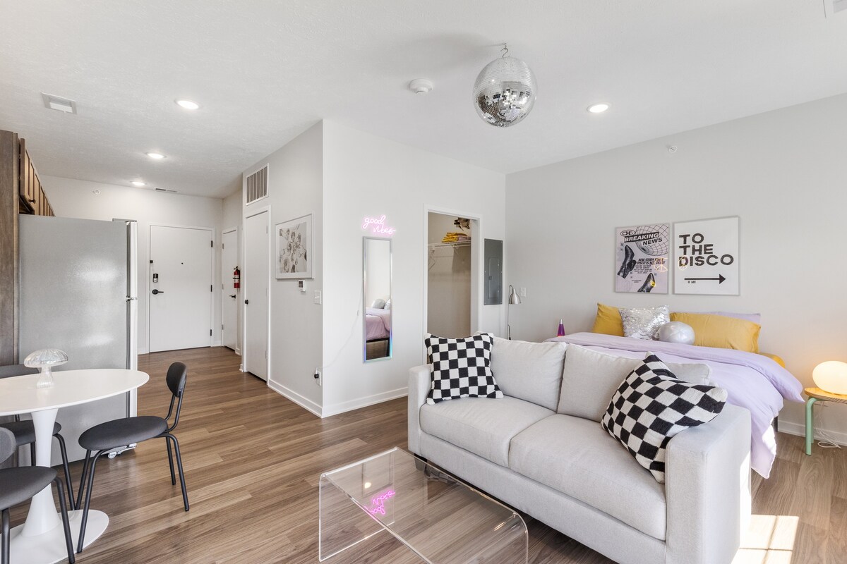 Chào mừng bạn đến với một studio theo chủ đề Disco rực rỡ ở Little Bohemia của Omaha! Bước vào kỷ nguyên của những quả bóng lấp lánh và đèn neon với lối trang trí đầy màu sắc và những tấm biển rực rỡ. Studio này cân bằng những rung cảm retro sôi động với sự thoải mái hiện đại, bao gồm TV Roku 50', nhà bếp được trang bị đầy đủ tiện nghi, máy giặt/máy sấy trong căn hộ, tất cả nép mình trong một khu phức hợp mới được xây dựng. Trải nghiệm sự kết hợp độc đáo giữa nét quyến rũ disco hoài cổ và sự sang trọng hiện đại trong trái tim lịch sử của Omaha. Hãy để âm nhạc chơi!