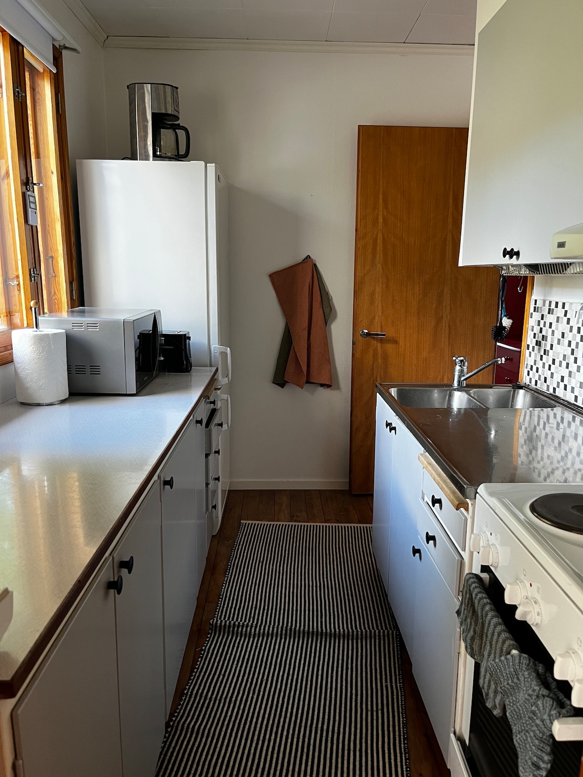 Nhà nghỉ thôn dã nhỏ ấm cúng với không gian mở, bếp nhỏ, bếp ga, lò vi sóng và tủ lạnh. Hai ghế quầy bar với khả năng ăn sáng bên trong. Một hốc ngủ nhỏ với giường đôi và phòng xông hơi riêng biệt. Có hai boong, một ở phía tây có bàn ăn cho 6 người với tầm nhìn tuyệt vời ra biển mở và đường chân trời. Ngoài ra còn có bồn rửa ngoài trời ở boong phía đông cũng như bếp nướng gas. Một nhà vệ sinh khô ngay bên ngoài phòng xông hơi khô cũng như một nhà tắm vòi sen và nhà giặt ủi mới được xây dựng riêng biệt cũng như nhà vệ sinh tủ đông cách đó một chút.