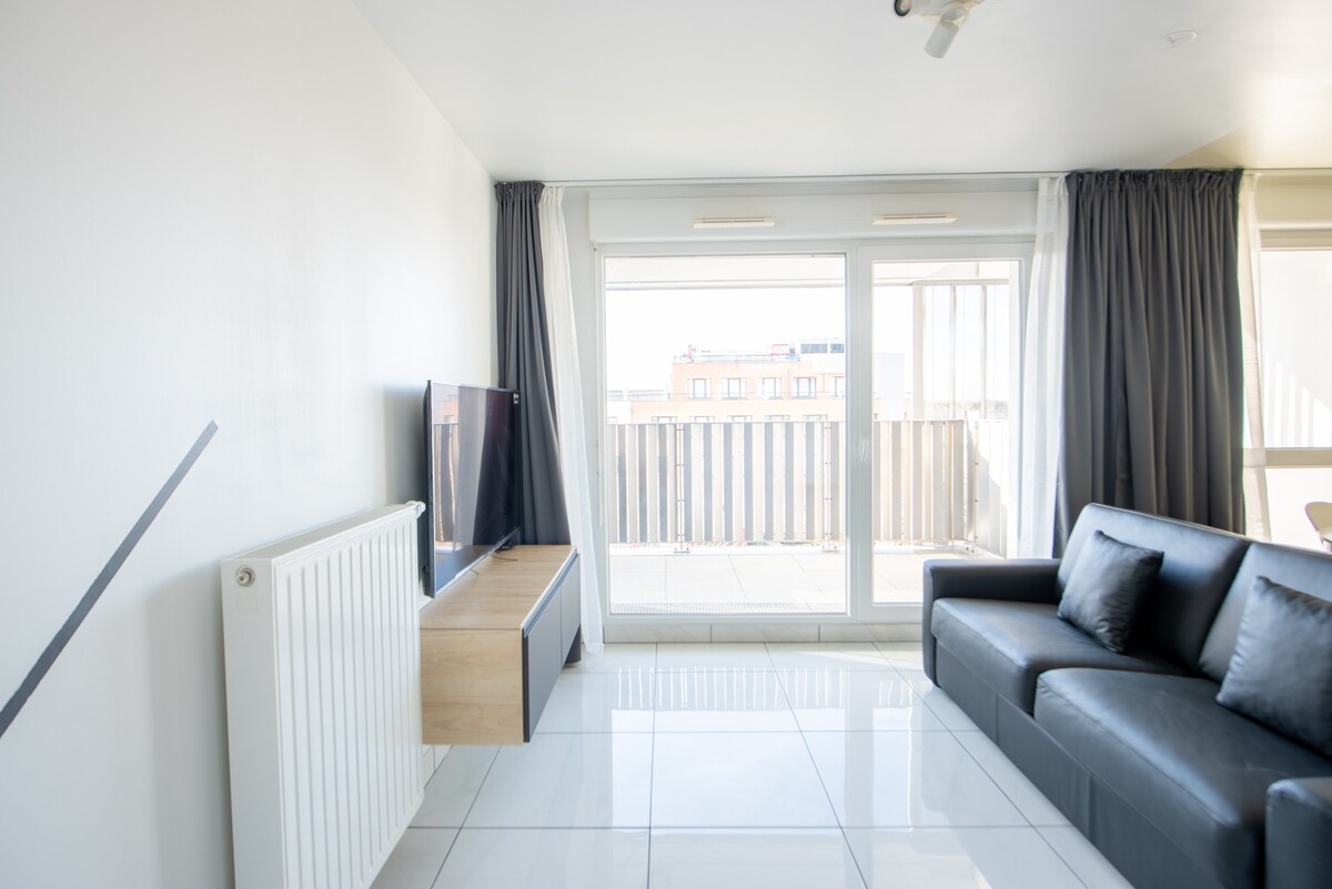 Studio de 32m2, parfait pour accueillir jusqu'à 2 personnes. Situé Résidence calme, à 5 minutes à pied de la gare, du C.Commercial Le SPOT et du tramway. À propos: ✦Arrivée autonome à partir de 16h00 grâce à notre serrure connectée. ✦Canapé-lit confortable 160x200 cm, pour se détendre. ✦Cuisine tout équipée machine à laver pour vos besoins. ✦Connexion Wi-Fi gratuite accès internet illimité. ✦Espace dressing comme chez vous. ✦Café et thé offerts : à votre arrivée, offerte par la maison.