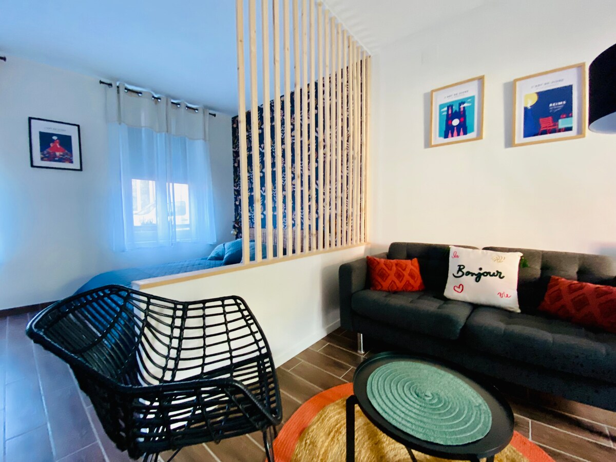 Ngôi nhà rộng 30 m² trong một trang trại cũ được cải tạo, nằm cách Reims 15 phút. Đây là một nơi yên tĩnh, với các cửa hàng gần đó của làng ( siêu thị, hiệu thuốc, nhà ga, v.v.) nhưng cũng có nhiều địa điểm du lịch ( vườn nho, nhà sâm panh, nhà thờ Reims...) Có chỗ đỗ xe.