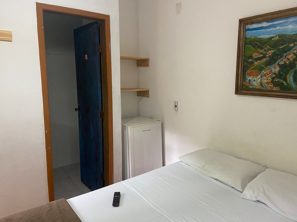 Quarto com banheiro privativo, TV, frigobar, ventilador de teto e ar condicionado com taxa adicional.