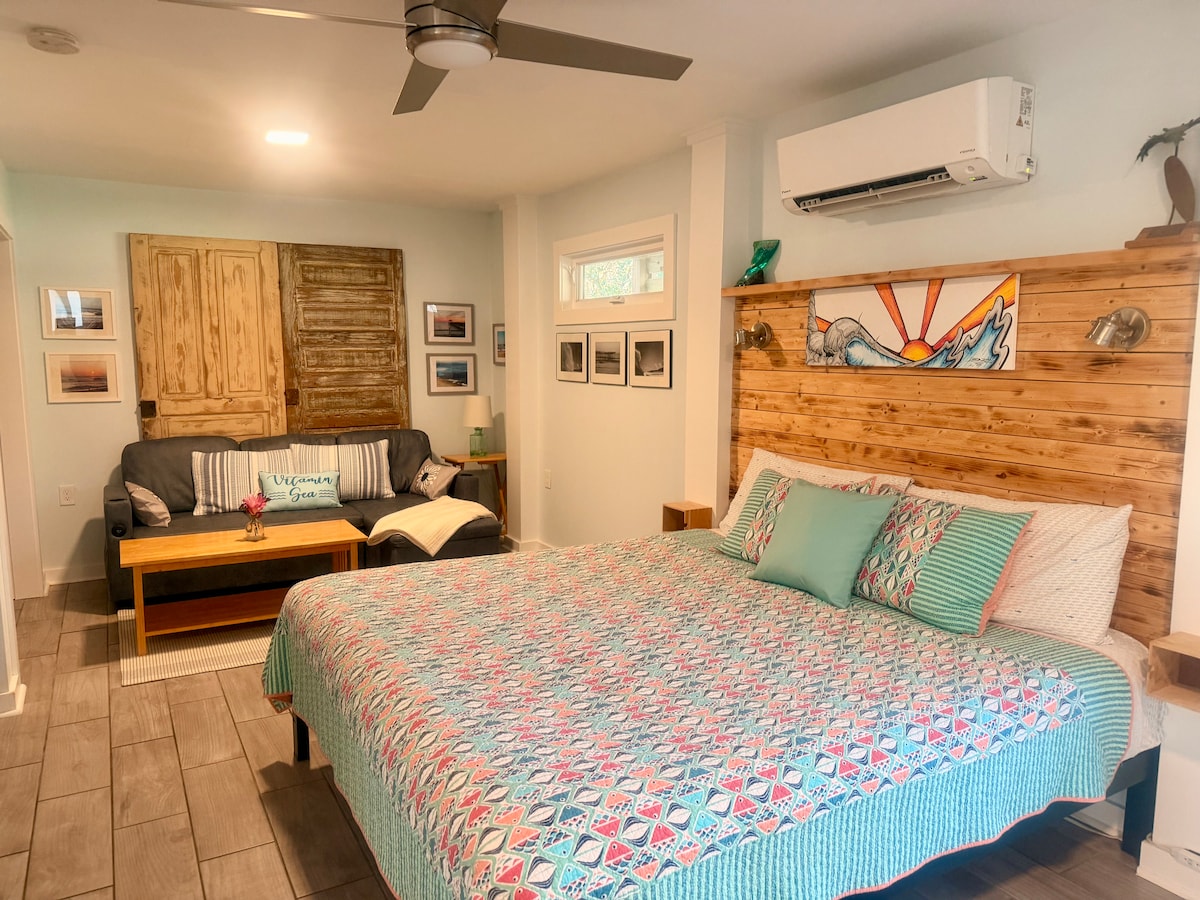Peaceful/airy studio Apt with a private ground floor entrance & hvac system. Inside features a plush king bed, seating area with coffee table and a smart TV. Savor your morning coffee at the bistro table or walk out the back private entrance door and enjoy the outdoor dining area over looking the pool and golf course. To start the day, you can walk to the best bagel shop on the beach. For lunch, hit the clubhouse a block away & for dinner 4 blocks away is the one and only "Ocean Blvd "