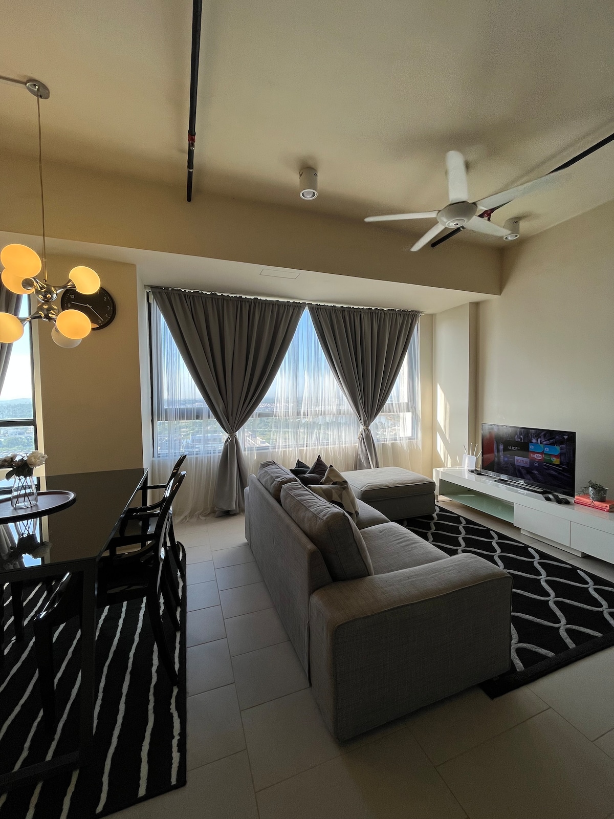 Rộng rãi và thân mật. Vì đây là căn hộ thứ 5 của tôi, chúng tôi đã bước lên một bước và thuê một bộ 1 phòng ngủ với khu vực sinh hoạt và khu vực ăn uống ấm cúng. Với khung cảnh tuyệt vời của Cyberjaya từ cửa sổ của bạn, không có gì tuyệt vời hơn thế này. Hoàn hảo cho thời gian lưu trú dài hơn để giải trí hoặc kinh doanh. Chúng tôi được kết nối với Quảng trường Tamarind thông qua một chuyến đi bộ có bóng râm với tất cả sự cần thiết mà bạn cần trong thời gian lưu trú.