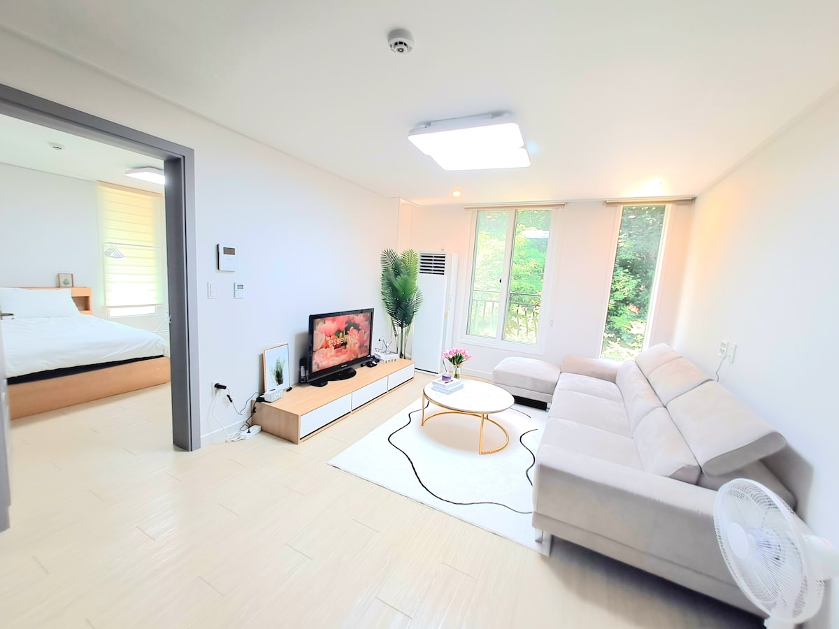 “지금, 여기서 행복하시길 바라는 진심”을 담아 청결하게 운영합니다. 짐보관 무료서비스 제공합니다. [숙소 소개] - 숙소 1층 무료 주차 - 엘리베이터 있음 - 각 방 에어컨 총 3대 - 공원뷰의 도심속 힐링 숙소(+고요함) - 방2[침대4개(3Q+1S)]+넓은 거실+욕실1 - 고급 원목 2층 퀸침대 - “안방” 대형 스크린 빔프로젝터 - “거실” 스마트 TV - 6인용 대형 식탁 - 고급 화장대 + 스튤 2개 - 암막 커튼 - 아기자기한 홈스타일링 이쁜 포토존 - 반려견 동반 가능(추가금 발생) [ 교통편] - 대전역에서 1호선 탑승 1개 정거장 중앙로역 도착 후, 2번 출구 도보 7분 - 대전역 KTX에서 도보 15분 [물품] - 호텔 침구(고온 살균) - 수건(고온 살균) - 드라이기 2대 - 비데 - 샴푸/바디워시/컨디셔너/치약 - 온냉수 정수기, 전자렌지, 그릇, 냄비, 후라이팬 - 세탁기 [8인이상 숙박시] - 8인부터 퀸토퍼 침구 제공