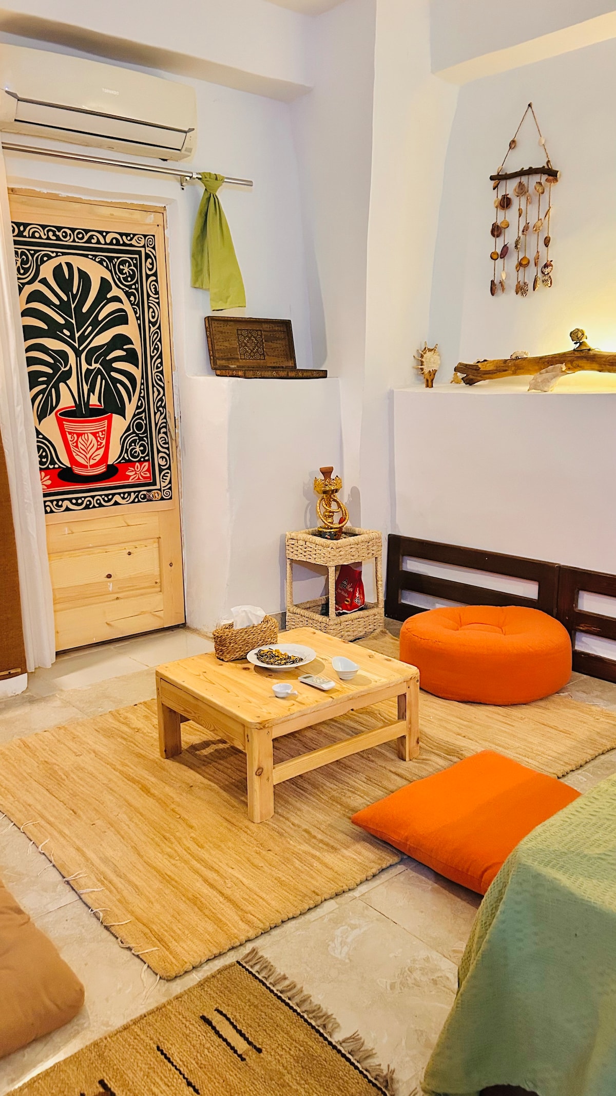 Boho Studio in Al-Asla Central location close to all services Supermarket and ATM, next to Al-Araishi Vegetables Just a few seconds to the beach 2 bedrooms Wi-Fi Hot water Nice outdoor space for coffee and hobbies