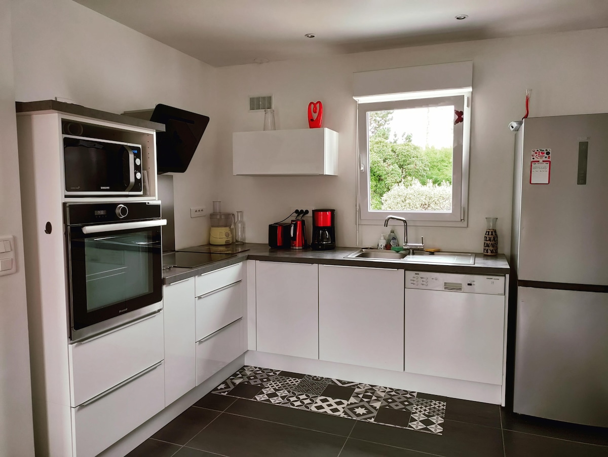 Ngôi nhà hiện đại rất sáng sủa với sân hiên lớn ngập tràn ánh nắng mặt trời từ sáng đến tối. Điểm cộng: phòng chính (song lập) bao gồm phòng khách , phòng ngủ, phòng tắm, phòng tắm , sân thượng, ban công trên lầu. Phần này có thể hoàn toàn độc lập. Tuyệt vời khi đón tiếp bạn bè. Vị trí hoàn hảo để tham quan Vịnh Morbihan và khu vực của nó. Bãi biển, lối đi xe đạp cách 150 m . Wifi. 2 xe đạp. Chèo thuyền kayak theo yêu cầu trước Thời gian tối thiểu: - trừ ngày lễ: 2 đêm, ngày lễ 3 đêm - Mùa hè: 7 ngày