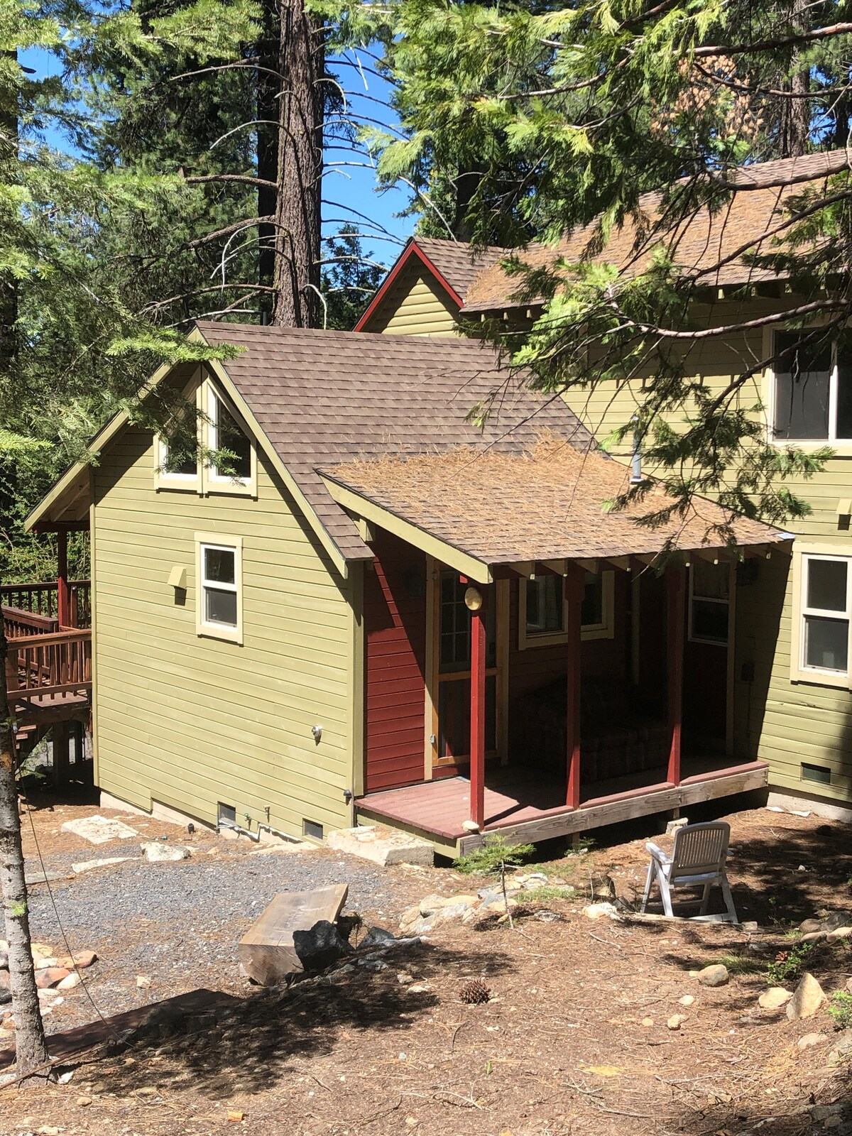 Đó là một cabin khung chữ A nằm giữa những cây thông cao chót vót của dãy núi High Sierras ở Bắc California. Ở độ cao 5000 feet, nơi đây mang đến một khung cảnh hoàn hảo cho một kỳ nghỉ trên núi tuyệt vời. Cabin có sự rung cảm mộc mạc và được trang bị các chi tiết chu đáo. Nó cách các cửa hàng tạp hóa, nhà hàng, sông và một trong những cây quý giá nhất hành tinh, Sequoias vài phút.