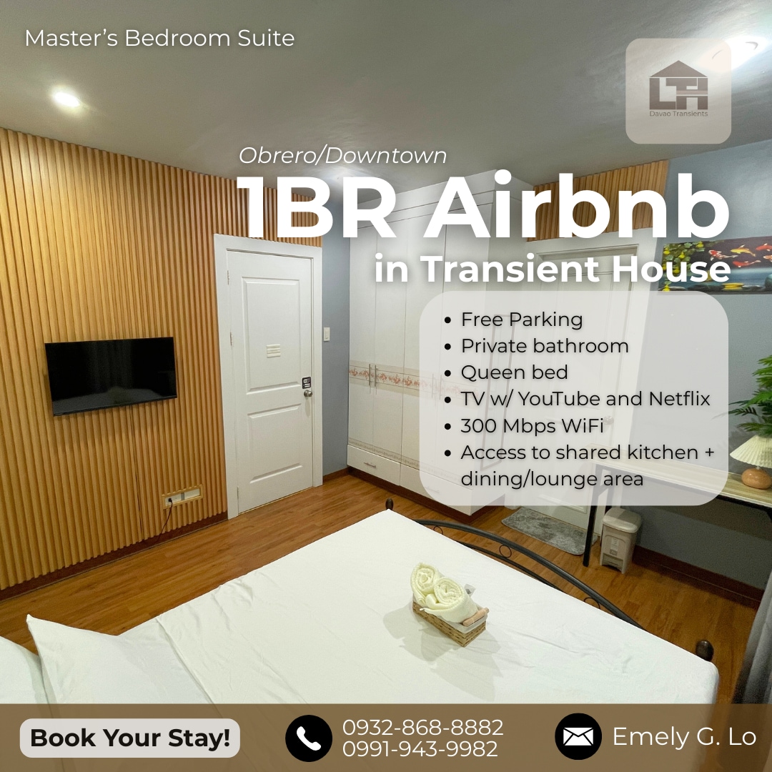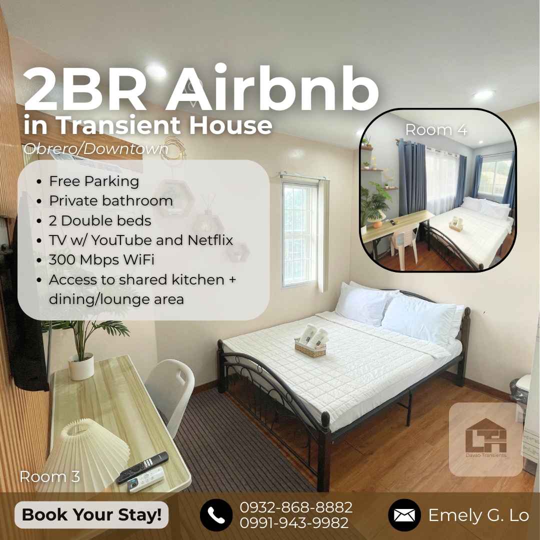 Townhouse cho thuê Trong phân khu an ninh, bảo vệ và có cổng Cách NCCC choicemart, 7-eleven & các cơ sở khác một quãng đi bộ. Cách sân bay 5 phút Cách Abreeza & Gaisano Mall 1 chuyến đi 10 phút đi xe đến bến phà Samal 2 phòng ngủ có điều hòa không khí đầy đủ tiện nghi W/chỗ đỗ xe Với wifi- MIỄN PHÍ 1gb mỗi ngày (có thể tải lại bằng chi phí riêng) Khách sẽ được cung cấp mã khóa sau khi đặt phòng được xác nhận. LƯU Ý: Phòng B sẽ đóng cửa nếu chỉ có 3 người ở
