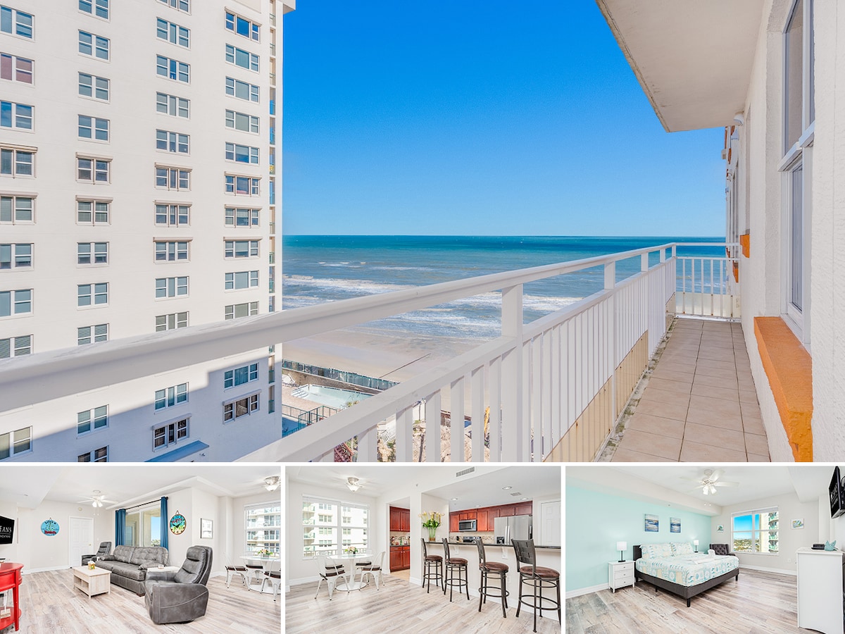 Cảnh quan TUYỆT ĐẸP HƯỚNG BIỂN! Căn hộ cao cấp được cải tạo + khung cảnh đại dương toàn cảnh. Master king suite ban công riêng hướng biển + phòng ngủ & phòng tắm thứ 2 = 2 giường queen. Nhà bếp MỚI có đầy đủ tiện nghi! Tiếp cận trực tiếp bãi biển không có ổ đĩa nguyên sơ với cát mềm/chắc chắn, hồ bơi nước nóng bên bờ biển. Kỳ nghỉ cao cấp phù hợp với gia đình - không khói thuốc và không có thú cưng. Thức dậy với bình minh Đại Tây Dương tuyệt đẹp! Tranquil Daytona Beach Shores Escape - đặt chỗ cho kỳ nghỉ thư giãn trên bãi biển vui vẻ của bạn! Được trang trí rất công phu cho Giáng sinh!