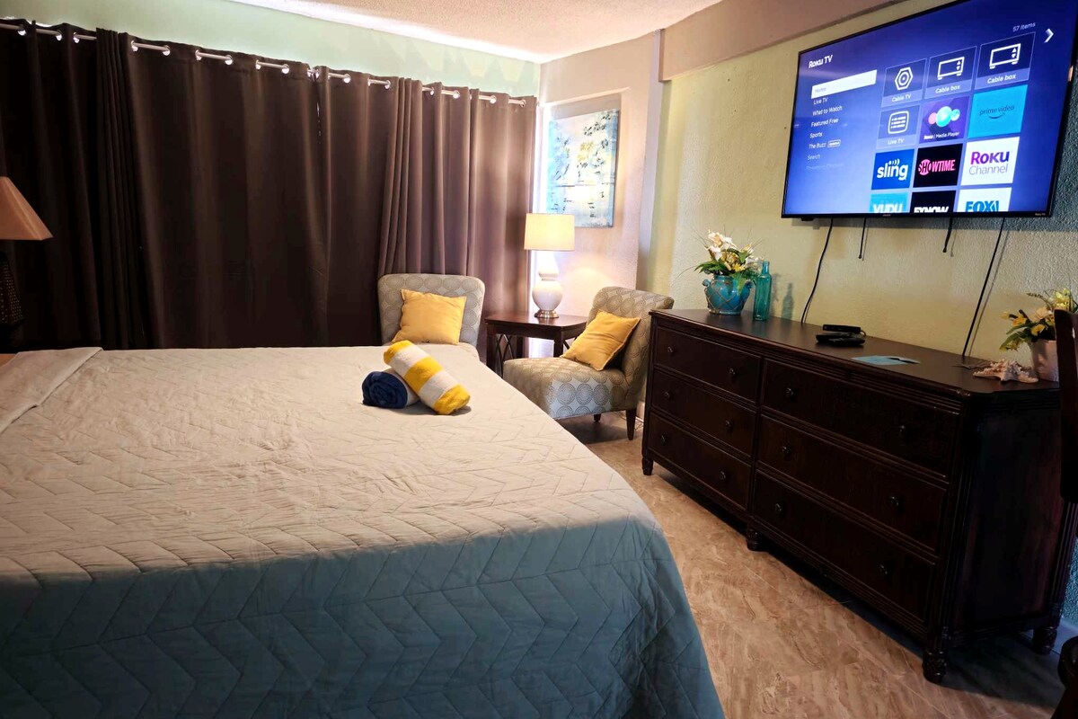 Căn hộ studio hướng biển với tầm nhìn đẹp. với ban công chung rộng rãi có chỗ ngồi. Giá hiện tại phản ánh việc sửa chữa liên quan đến bão và việc đóng cửa một số tiện nghi đang diễn ra. Lý tưởng cho những khách coi trọng việc ở gần bãi biển và tầm nhìn ra đại dương hơn sự hoàn hảo và hiểu những thách thức. Một số mục đã mở gần đây: **Tiện nghi mở cửa • 8 giờ sáng – 8 giờ tối • Một hồ bơi ngoài trời - Bể bơi trong nhà • South Spa • Trung tâm thể dục/Phòng tập thể dục • Phòng xông hơi khô ** Yêu cầu đăng ký chính cho khách với giấy tờ tùy thân thông qua cổng thông tin dành cho khách.