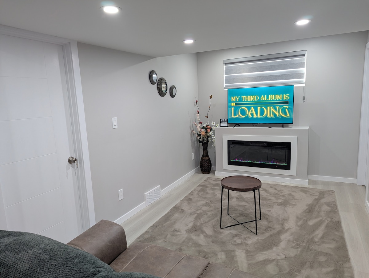 New Private built basement apartment has a functional kitchen which comes with a cooktop, fridge, microwave, kettle, coffee brewer, cutlery as well as basic cooking and serving utensils for your use. The room is with all the comfort of a home, queen and sofa beds that are warm and cozy for a perfect sleep. All rooms have Smart TVs. Fresh/clean towels are provided. It is located in the serene environment of the city with a functional Transit bus system. Parking spot available.