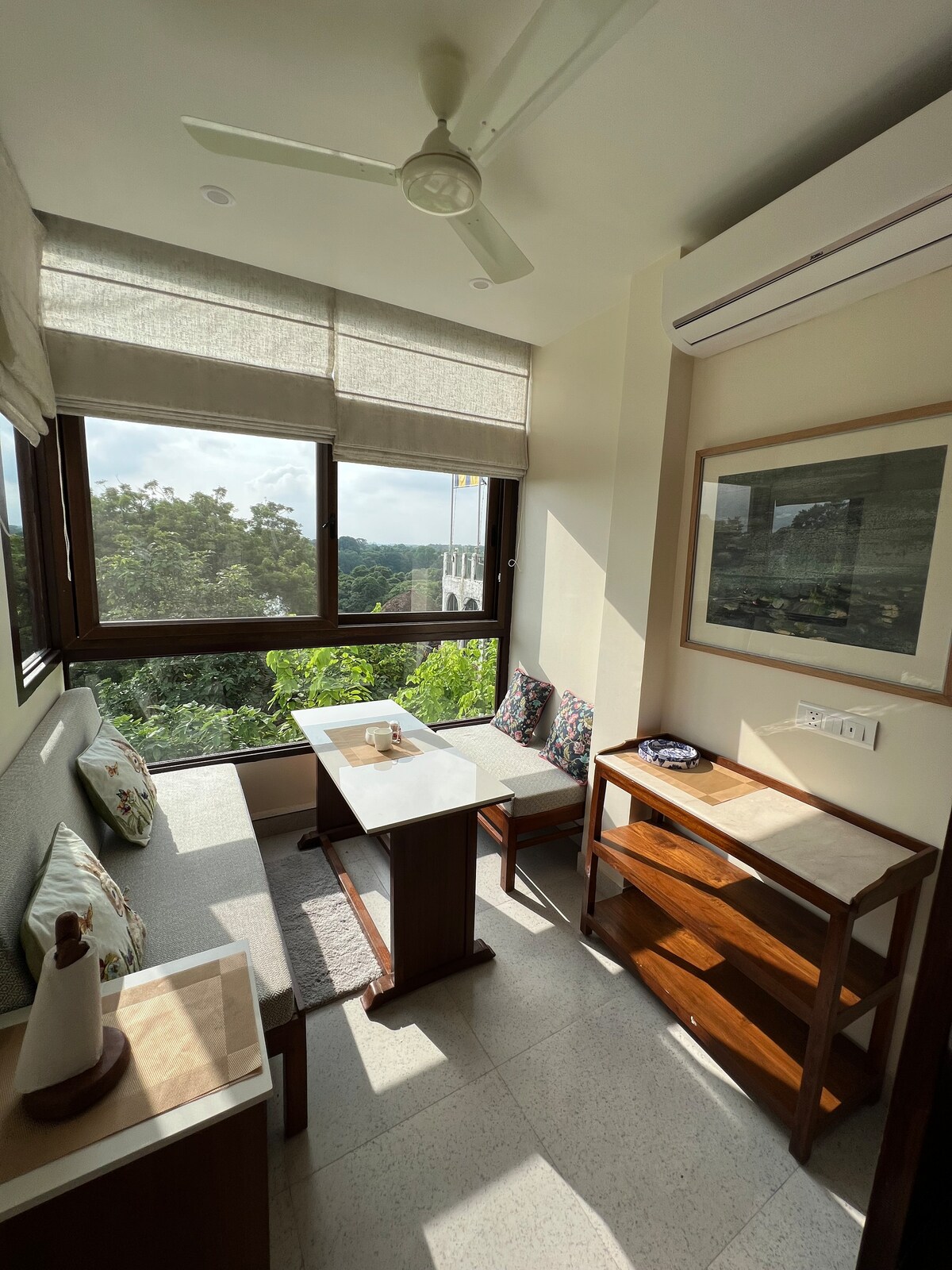 ➽ Căn hộ 1BHK rộng rãi với sân hiên kèm theo, điều hòa không khí đầy đủ. Tất cả các phòng đều có máy lạnh 1,5 tấn. Chỗ ở hướng ra ánh nắng ➽ mặt trời trong một khu phố có thu nhập cao, mở cửa ba chiều, hướng ra công viên và thông gió tốt với ánh sáng tự nhiên dồi dào và không khí trong lành. Máy chiếu ➽ cao cấp với loa soundbar 25W và Amazon FireStick với các ứng dụng OTT. Nhà bếp ➽ đầy đủ tiện nghi với các tiện nghi thiết yếu để nấu ăn thuận tiện. ➽ Thư giãn trên sân thượng riêng tuyệt đẹp với đèn xung quanh và hệ thống Foger độc đáo để làm mát sân