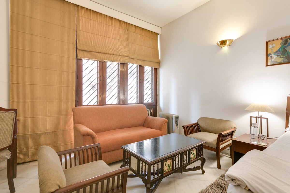 Self Check in available Free breakfast included Fully equipped private apartment with kitchen on split level overlooking terrace. Private terrace and balcony surrounded by lush greenery. Centrally located in a historic neighborhood in New Delhi. Private floor within a house shared with my family. Shared spaces include: laundry (at request) and gym equipped with dumbbells and free weights. Wifi included. Peaceful, well-lit, and walking distance to gardens, cafes, and heritage sites.