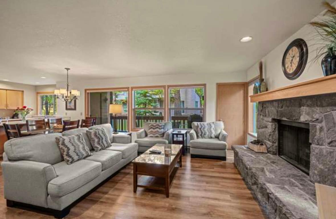 Plan your getaway to Sunriver and relax in this cozy and updated condo. It's the perfect base camp for all your central Oregon adventures. Warm up by the fire after a day of snow-shoeing or enjoy a cold drink in the summer on the back porch after a day at the SHARC. 6 passes included! The condo is a corner unit and located right next to Lake Aspen. You can walk, jog, or bike to the Nature Center, SHARC, stables, or the Sunriver Village. There is a shared pool at condo too! Everything is close!